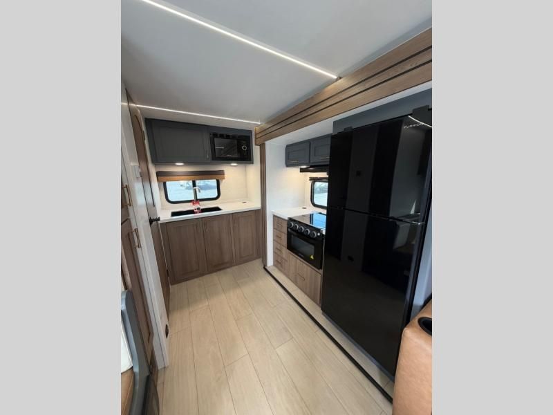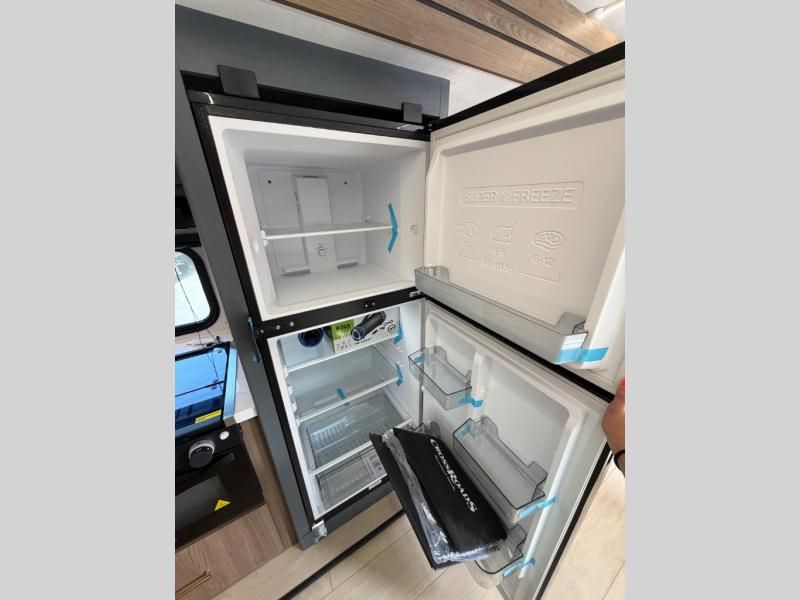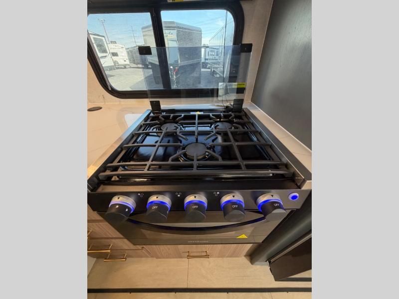 Kitchen: 10 cu. ft. 12V refrigerator, 3-burner range with glass cover, and microwave