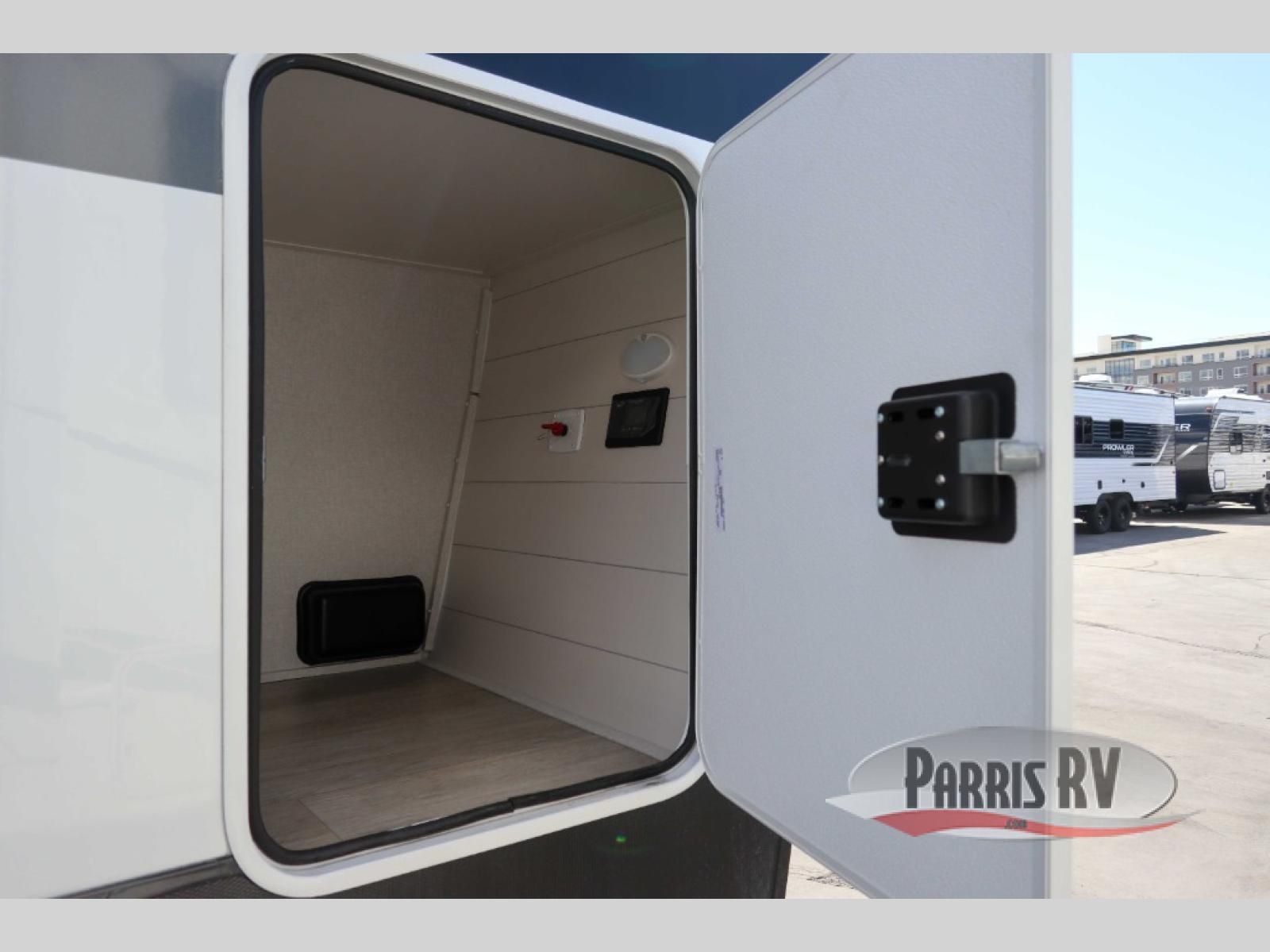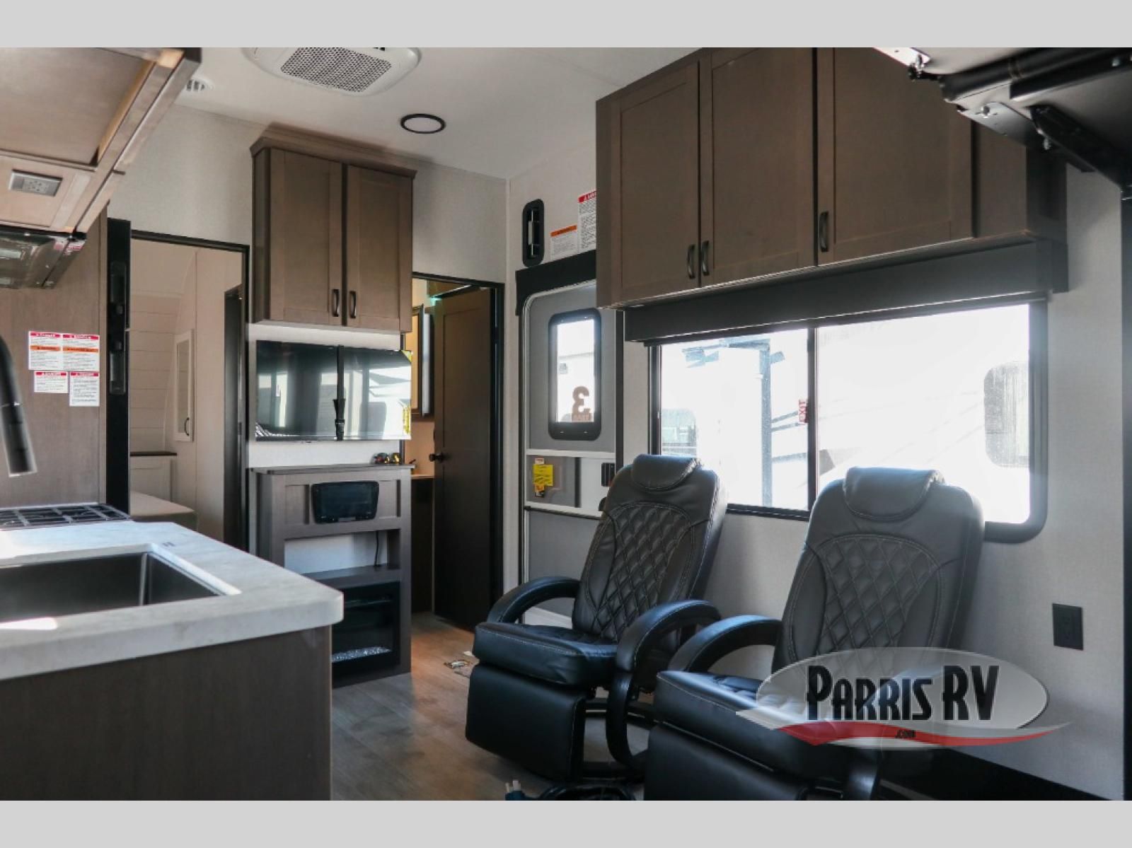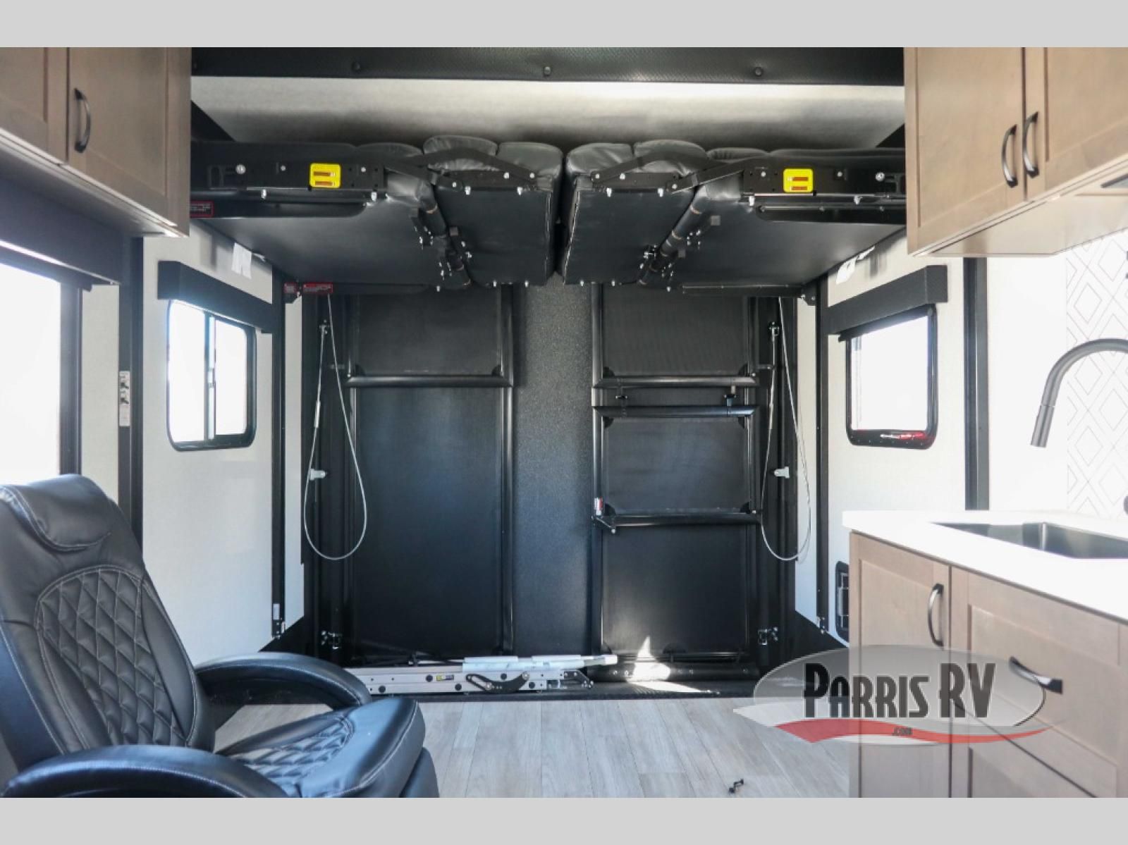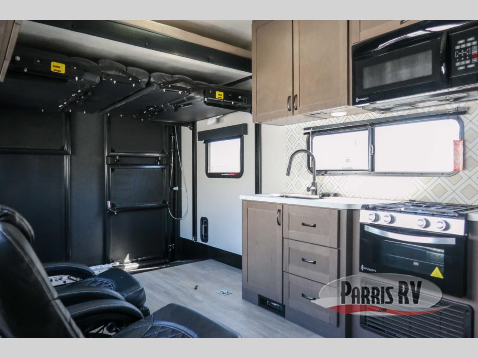 This toy hauler features 14' total garage space when you utilize the space all the way up to the master bedroom. The front is also shared with the dual entry bath for added convenience, and you'll enjoy a king bed in the bedroom for added comfort. A three-burner cooktop and space-saver microwave will let you make meals each day, and a 12V refrigerator will keep your cold items fresh. The Euro chairs and dual sofas provide comfy seating spaces, and the drop-down electric queen bed gives your guests a place to sleep.