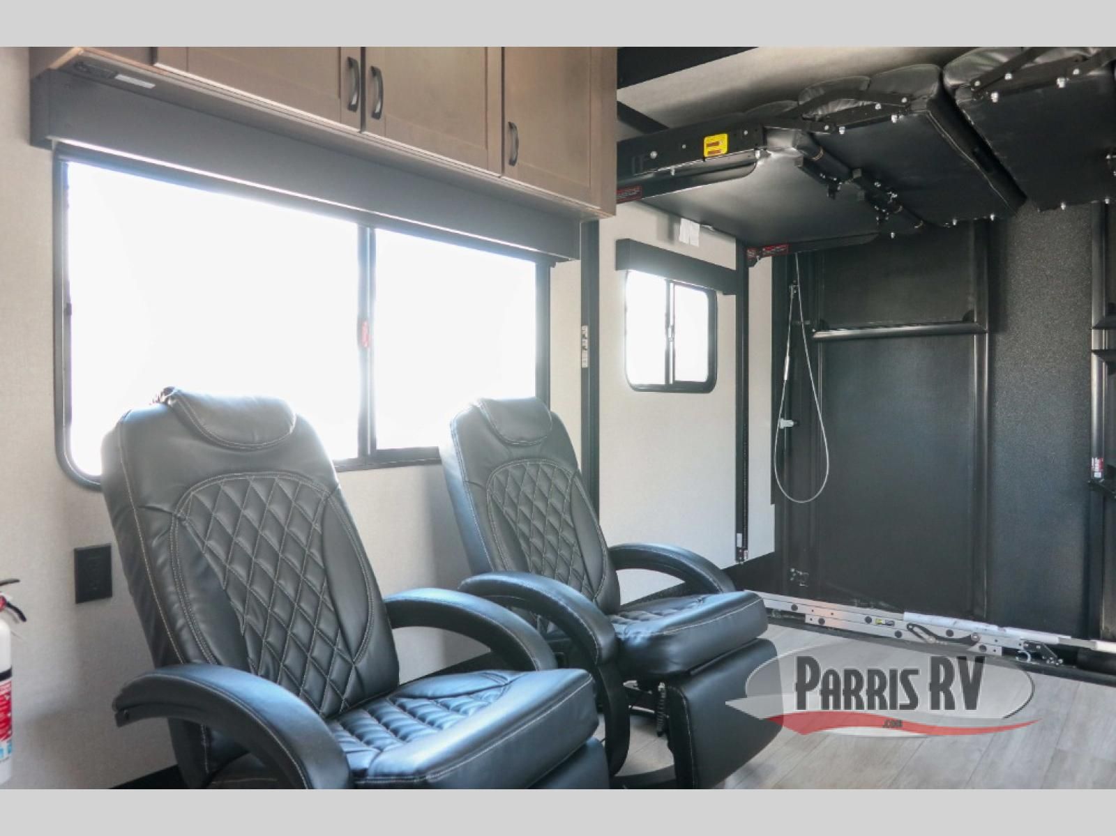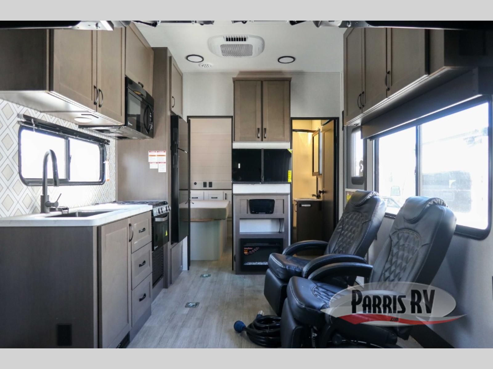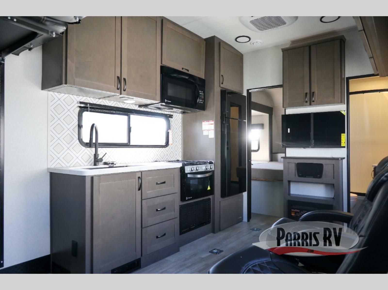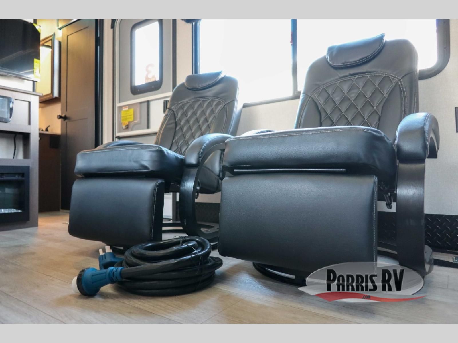 This toy hauler features 14' total garage space when you utilize the space all the way up to the master bedroom. The front is also shared with the dual entry bath for added convenience, and you'll enjoy a king bed in the bedroom for added comfort. A three-burner cooktop and space-saver microwave will let you make meals each day, and a 12V refrigerator will keep your cold items fresh. The Euro chairs and dual sofas provide comfy seating spaces, and the drop-down electric queen bed gives your guests a place to sleep.