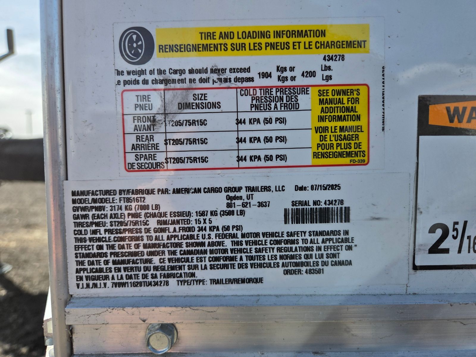 TRAILER FEATURES: -19” Platform Height -3,500 lb Tandem Axle -16” OC Crossmembers -24” OC Tube Roof Bows -32” Side Entry Door with Bar Lock -Aluminum Roof
