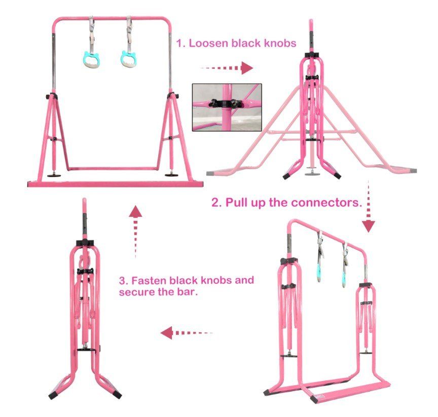 Adjustable Heights:The folding kip bar can be easily adjusted the heights with 9 options, from the lowest height 33‘’ to the highest 49‘’ with an interval 2‘’. The multiple height adjustments are perfect for girls and boys to practice their various skills and for them to just play.