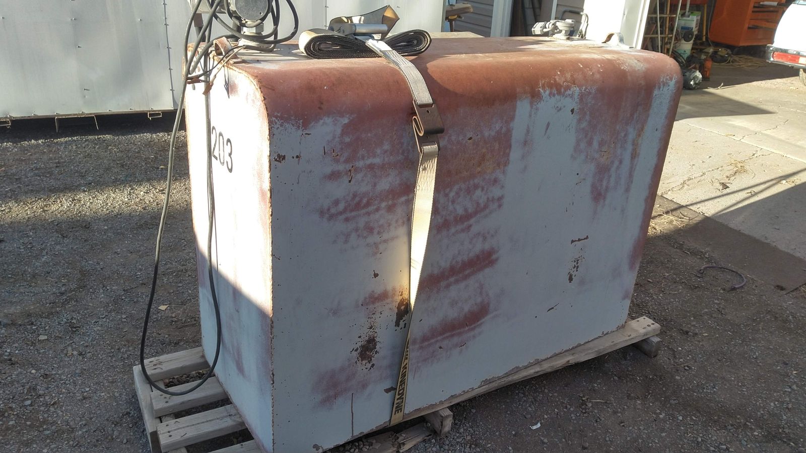 ZelleFuel Tank with 12 V pump. 265 Gal. Tank fill and pump are locking and comes on pallet for moving around the jobsite or farm. 1/2 full of fresh red diesel that I will sell for additional $3.50 gal. if buyer is interested if not I will simply pump it off. Asking $950 for tank with pump. Forklift onsite to load it for you. Delivery available. Located in American Falls Id. Call / text Randy 208.220.7105