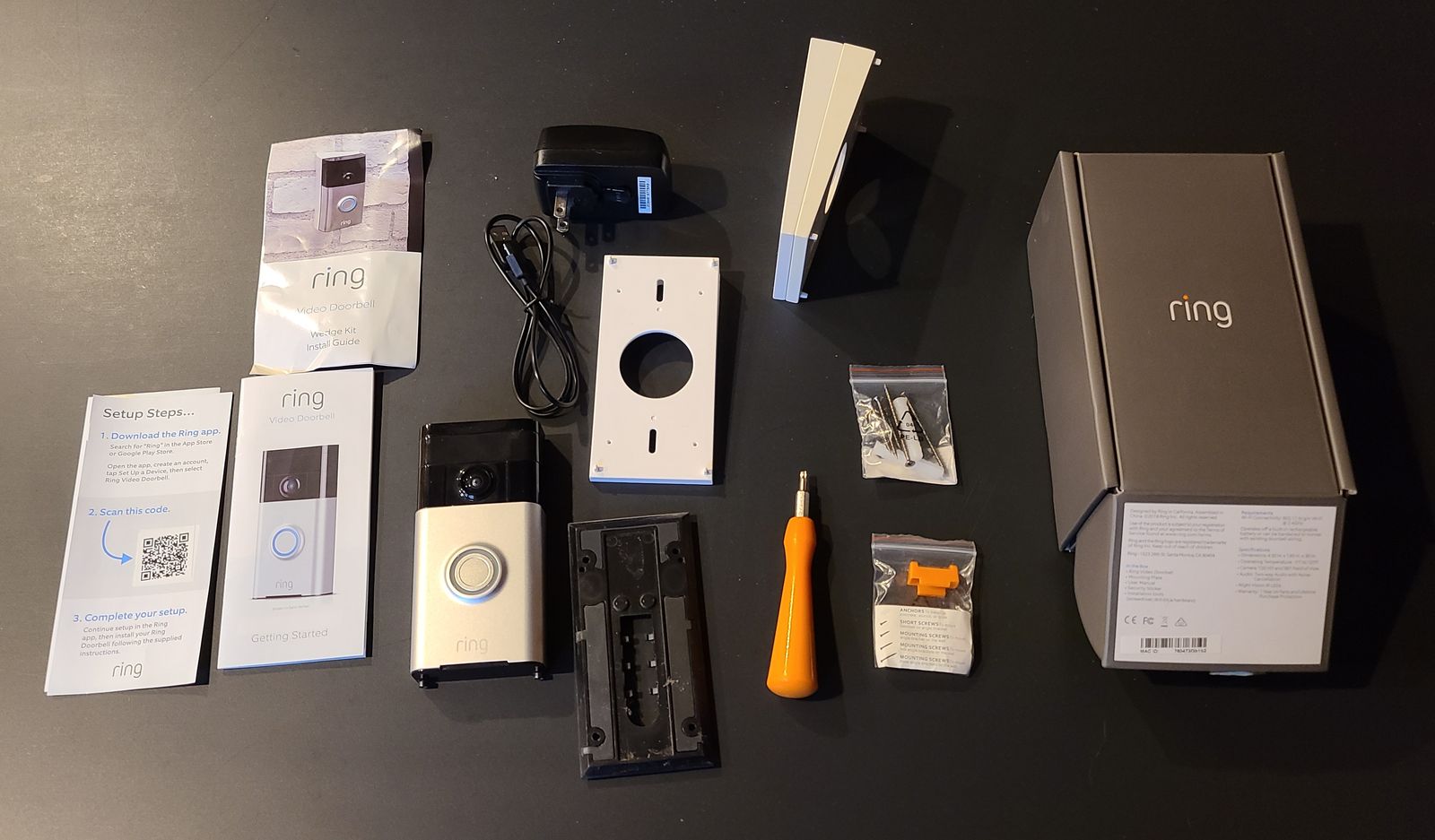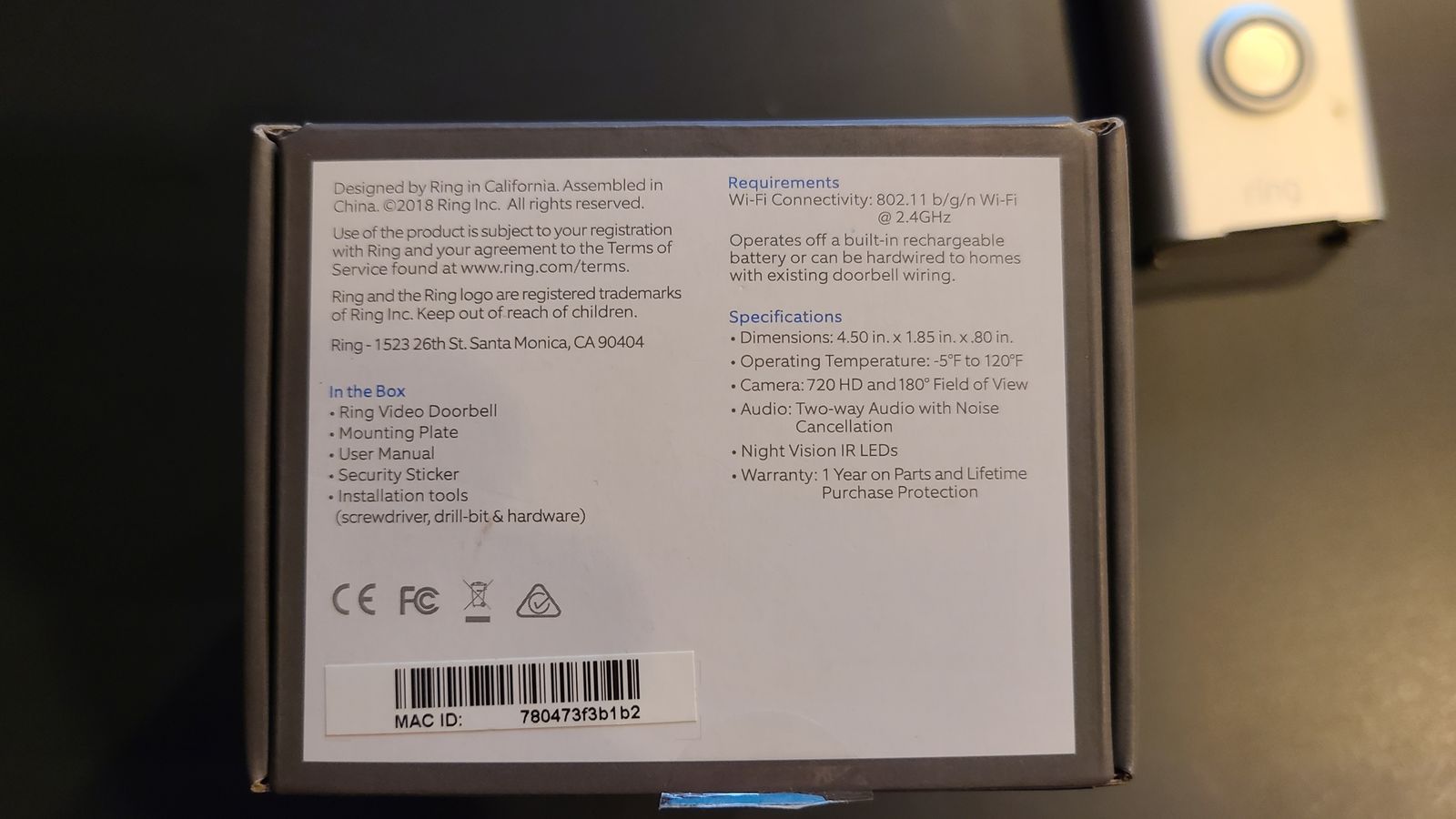 Wired or built in rechargeable battery. Includes three sizes of wedges to enable tilting the bell down, if needed. Camera has: 720 HD and 180 field of view; Dimensions: 4.5 in x 1.85 in x .80 in; Two-way audio with noise cancelation; Night Vision IR LEDs