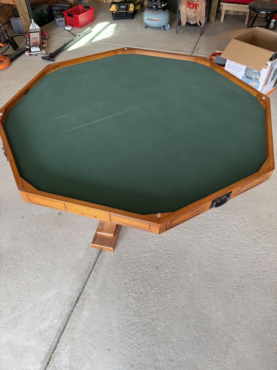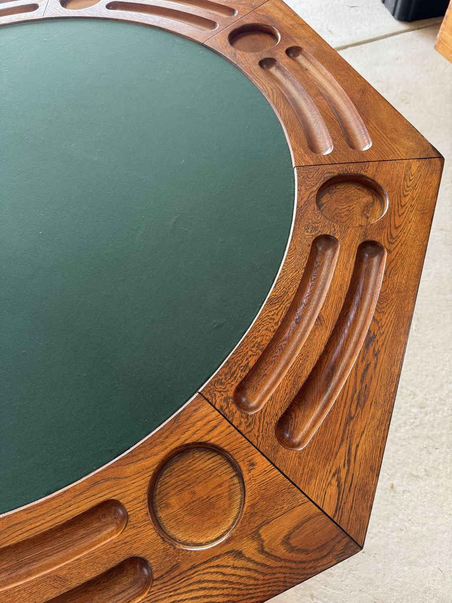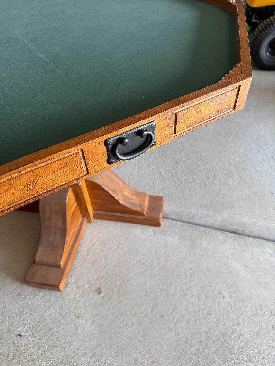 Wooden poker table with green felt. Reversable table top. In very good condition. Comes with four rolling armchairs with nice cushions.