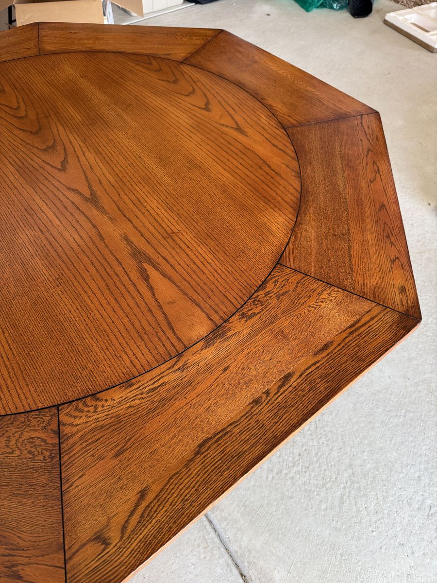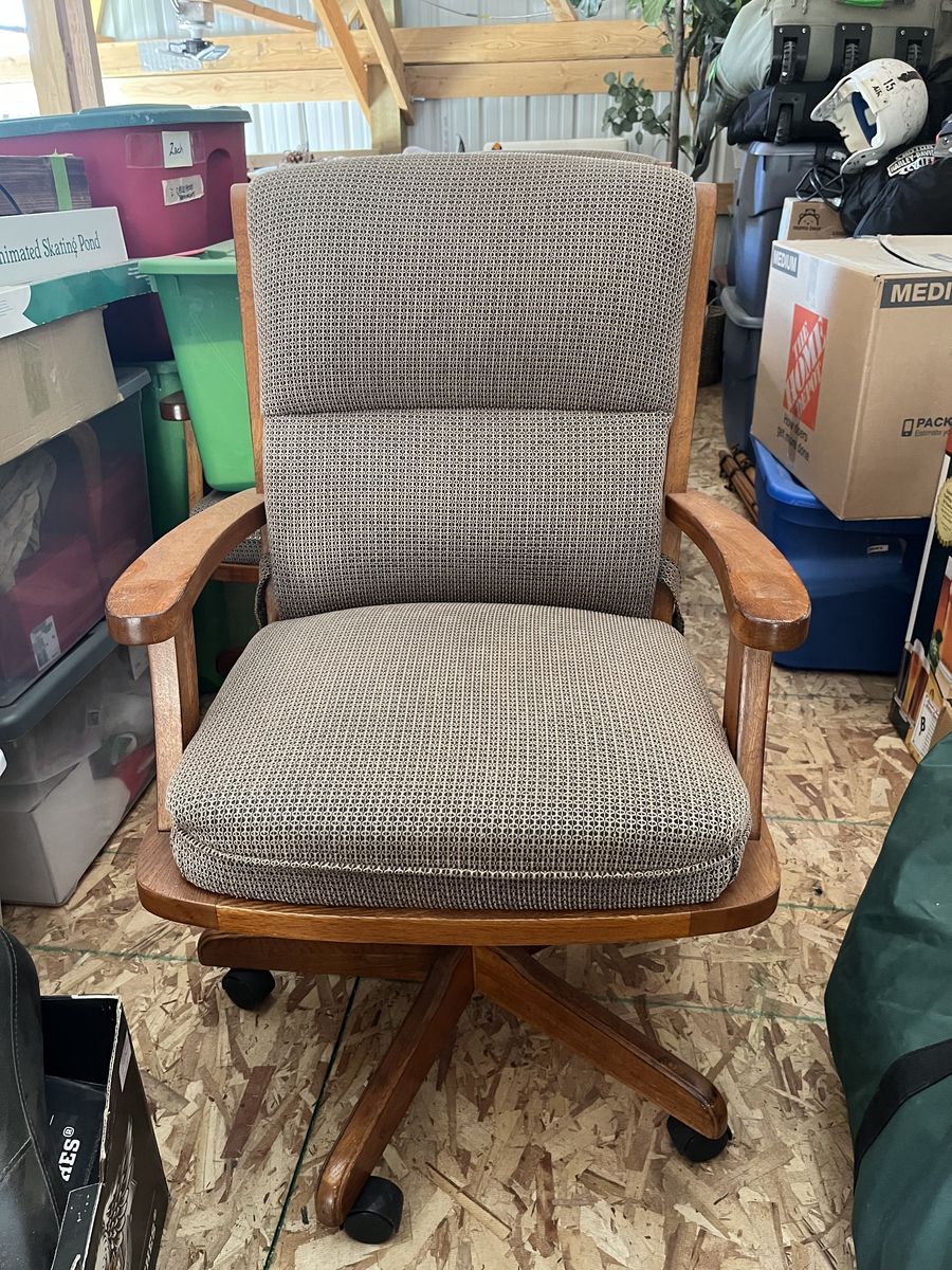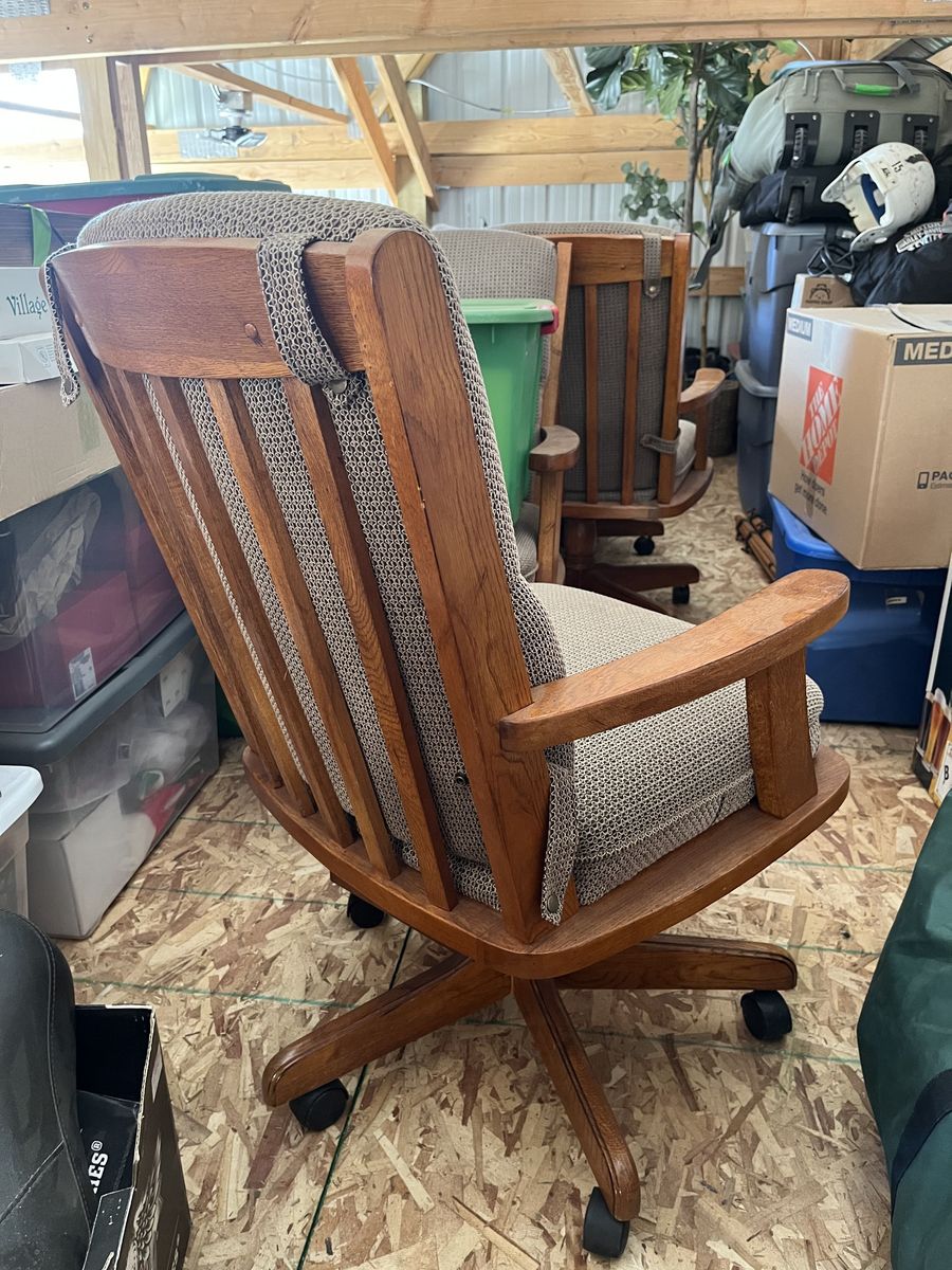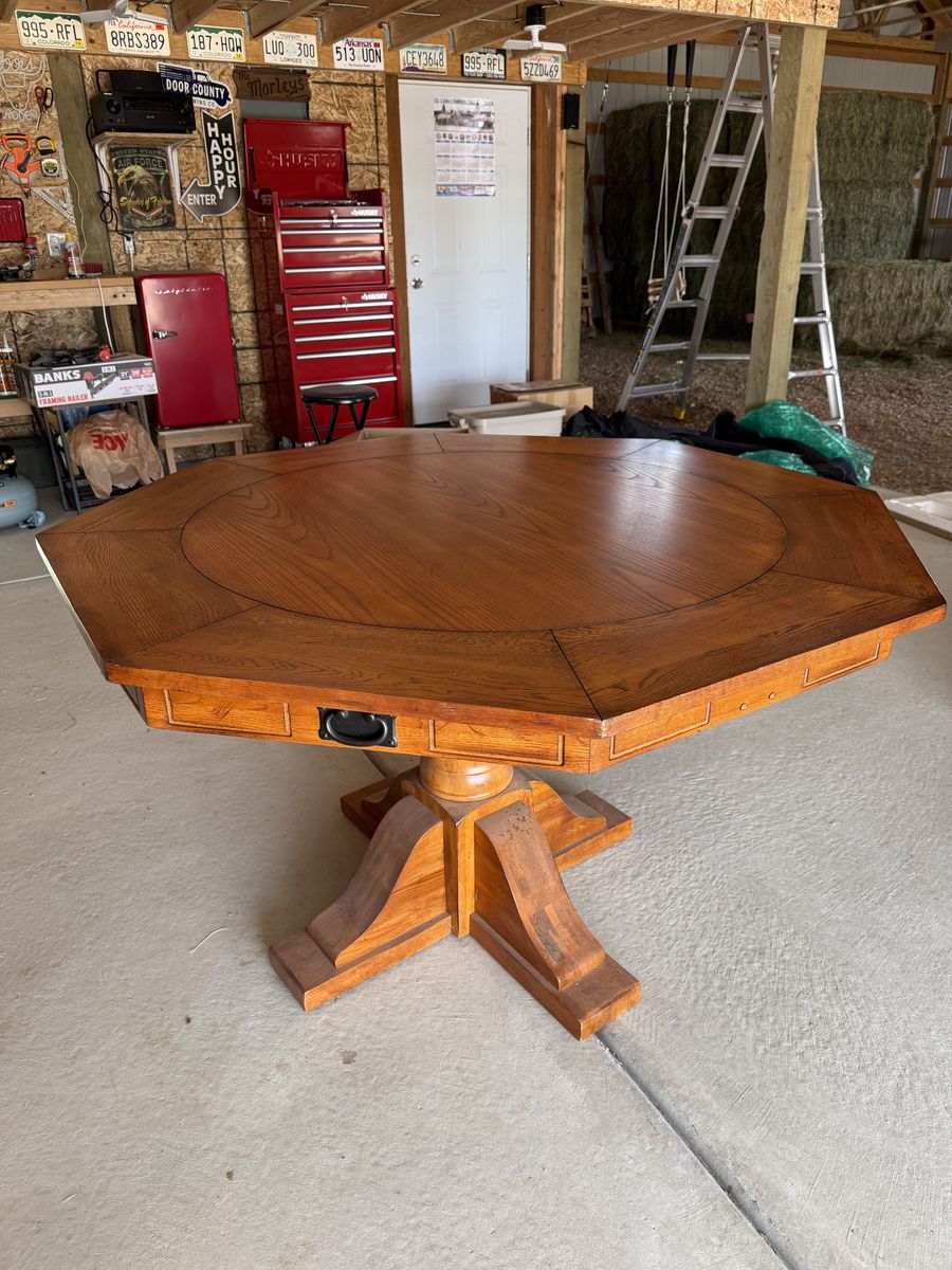Wooden poker table with green felt. Reversable table top. In very good condition. Comes with four rolling armchairs with nice cushions.