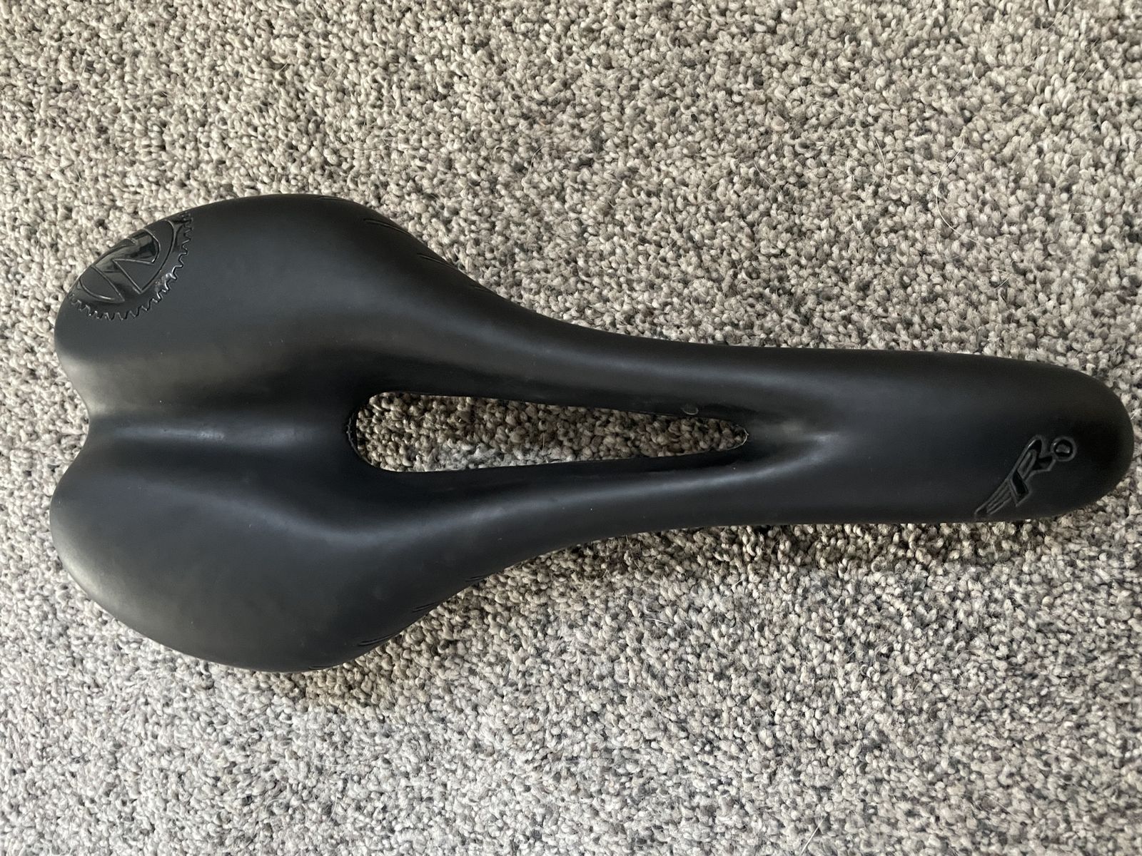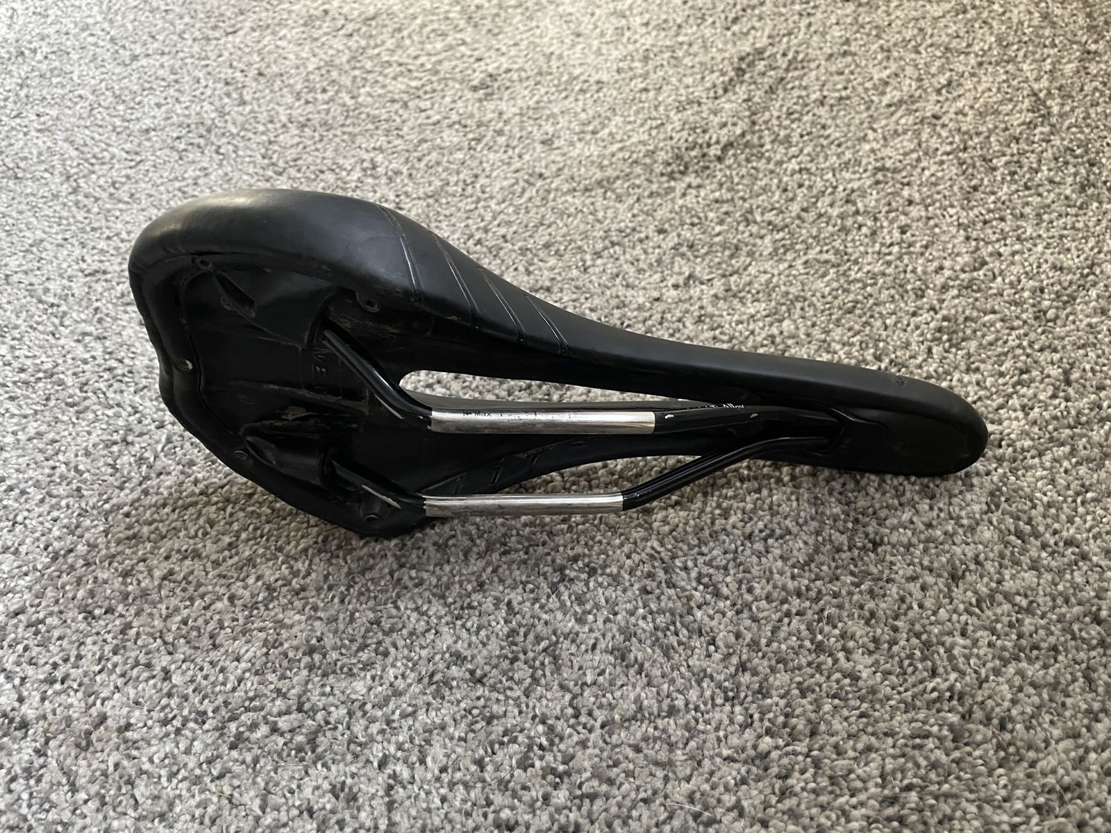 Venmo130-135 mm wide road saddle from bike nashbar circa 2018 or so. Titanium rails, good padding, in great shape. 250 grams. I just needed a slightly wider saddle