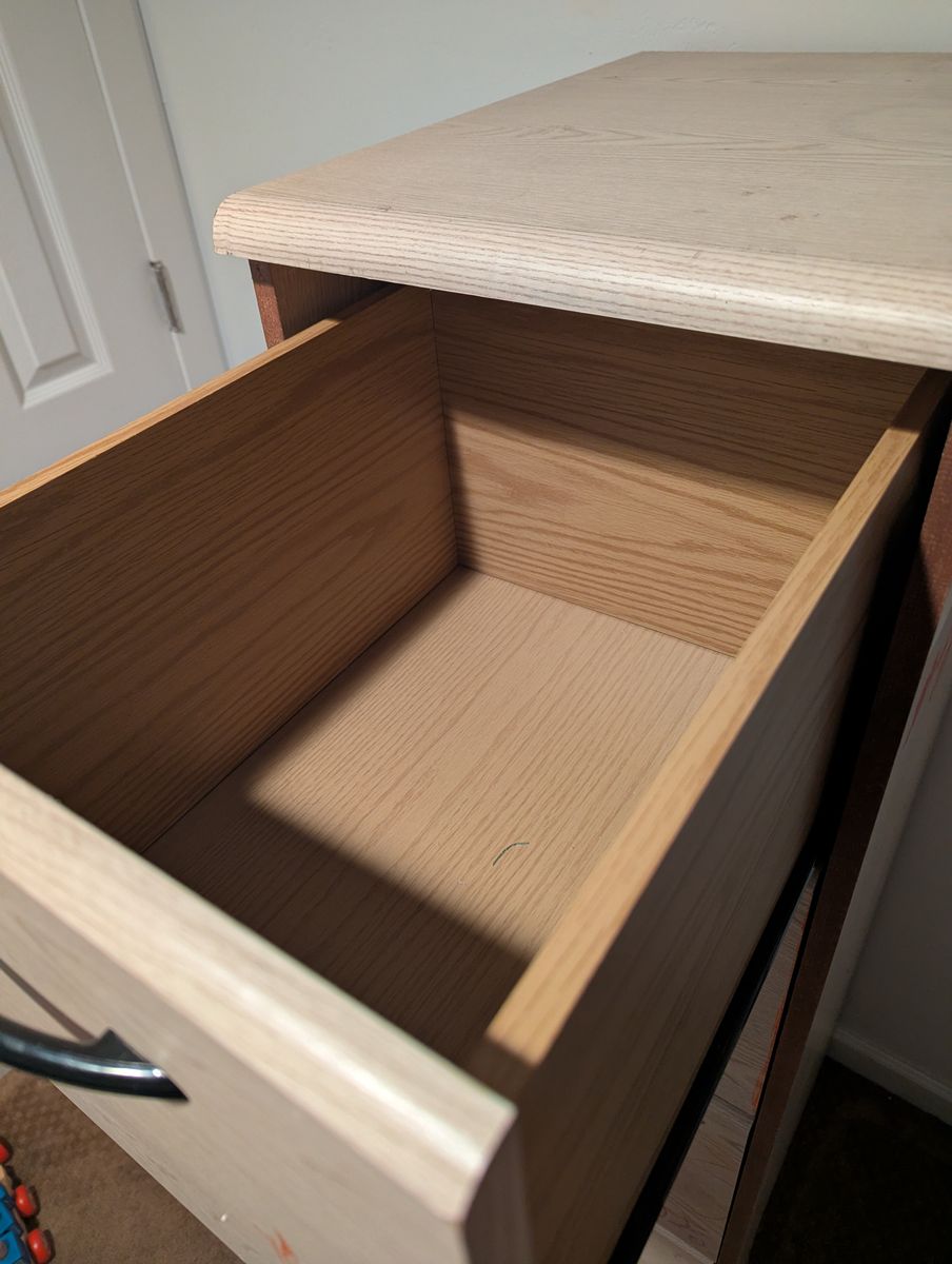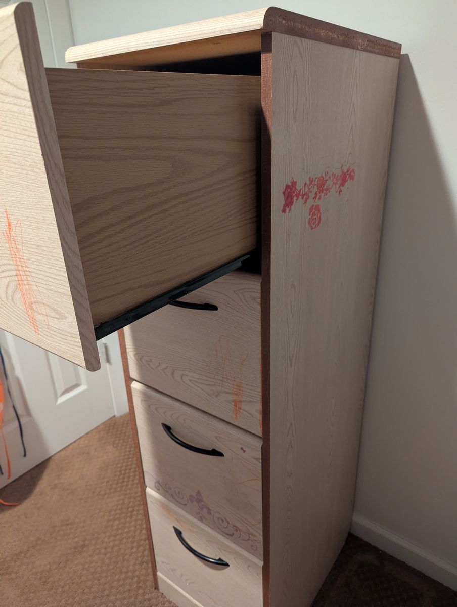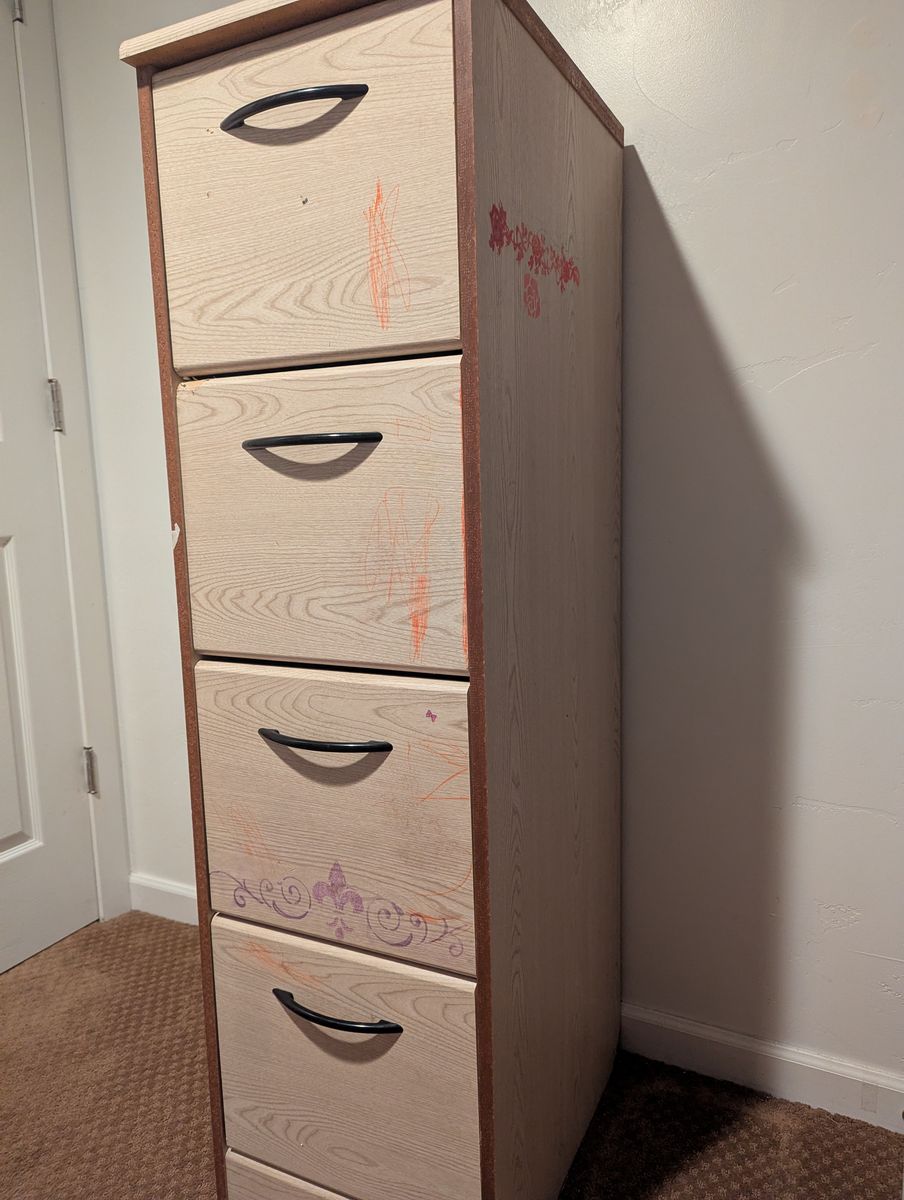 4 Drawers. As the picture shows there is some damage as well as drawings. It is about 1'7.5" L X 1'3.5" W X 4'6" H