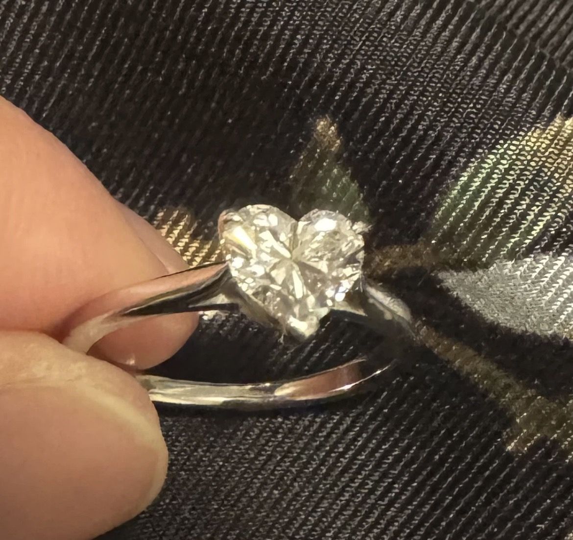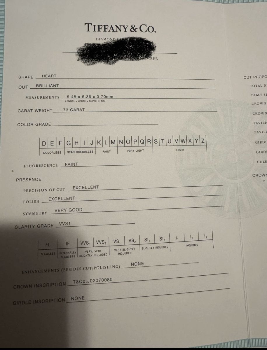 Platinum, Sz 4.5, .73 ct, Color I, Clarity vvs1, The current market value for a diamond half this dive and a lower color/clarity on the TCo site is going for over 12k.