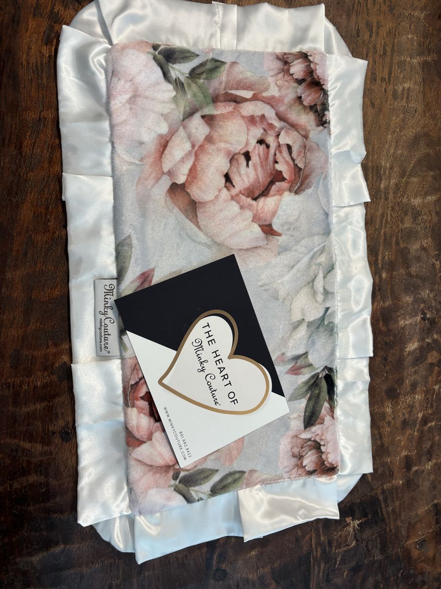 Venmo• Two brand new Minky Couture lovey-size blankets in a beautiful pink floral and polka dot print — soft minky fabric with satin trim edges • Minky Couture is a Utah-based luxury brand known for their ultra-soft, high-quality blankets — these make perfect baby shower or newborn gifts • New, never used — both included in this listing!