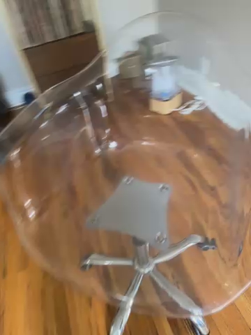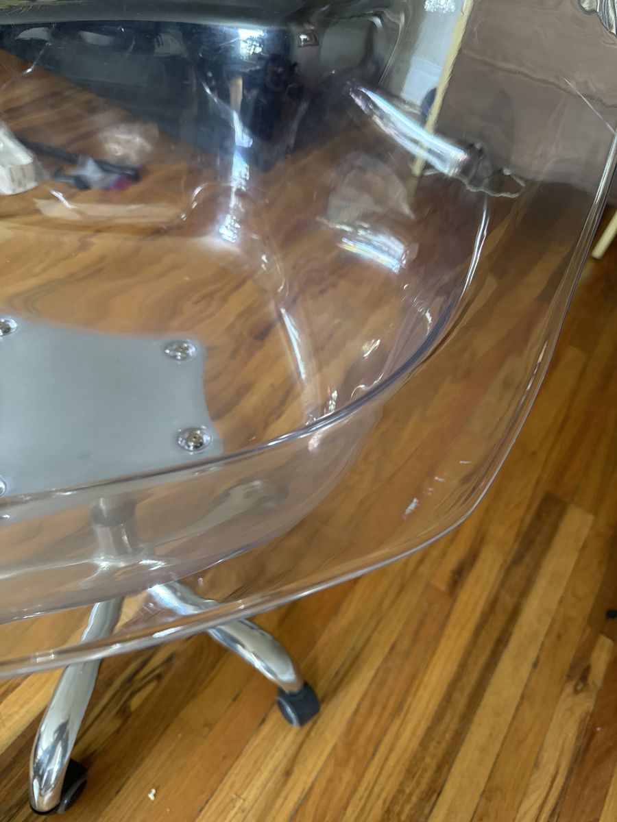 ApplePayChair purchased in 2013 so has wear but in very good condition. This chair can raise and lower and is on wheels. Because it is clear acrylic it works great for small spaces since it doesn’t look like it takes up space.