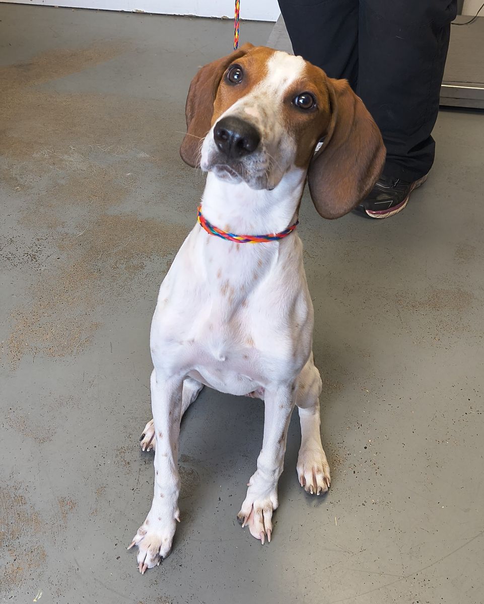 Hi, I'm Mini, a 10-month-old American English Coonhound with a not-so-mini personality and a heart that's anything but small. I'm the kind of girl who believes every person I meet is my new best friend, and I'm always ready to say hello, lean in for attention, or invite you to play. I've got a fun, playful side and a curious spirit, and I'm still figuring out this big world, so I'll be looking to you to help me grow into my best self. I can get a little bouncy and enthusiastic-what can I say, I'm just a Mini with maximum excitement-so I'd love someone who can show me the ropes and help me channel all this energy into being a well-mannered lady. With a little patience, encouragement, and maybe a few treats (okay, definitely a few), I'll be your loyal sidekick, your adventure buddy, and proof that sometimes the best things come in Mini packages.