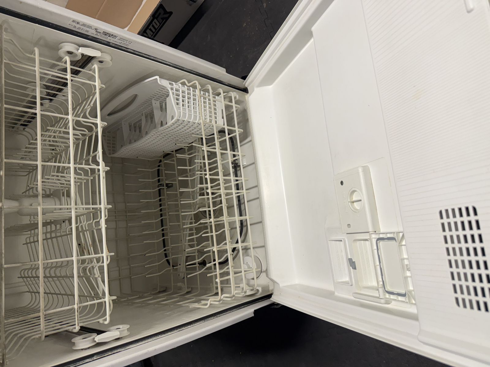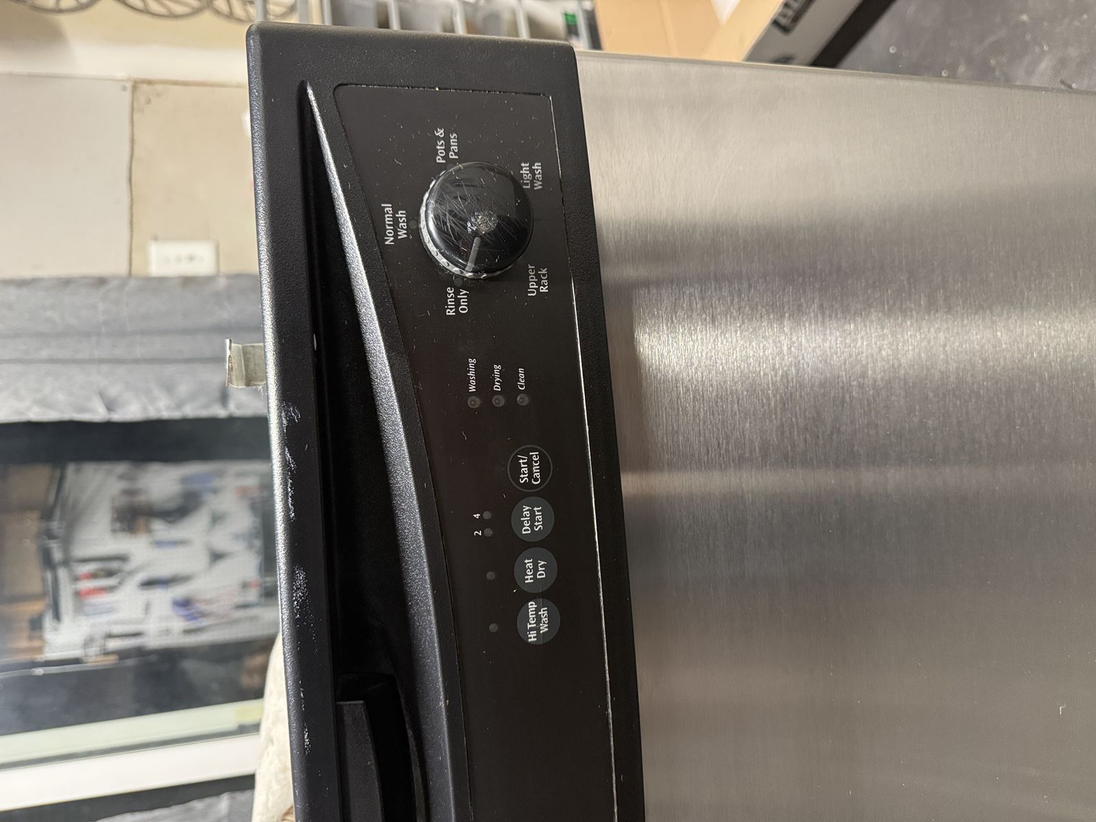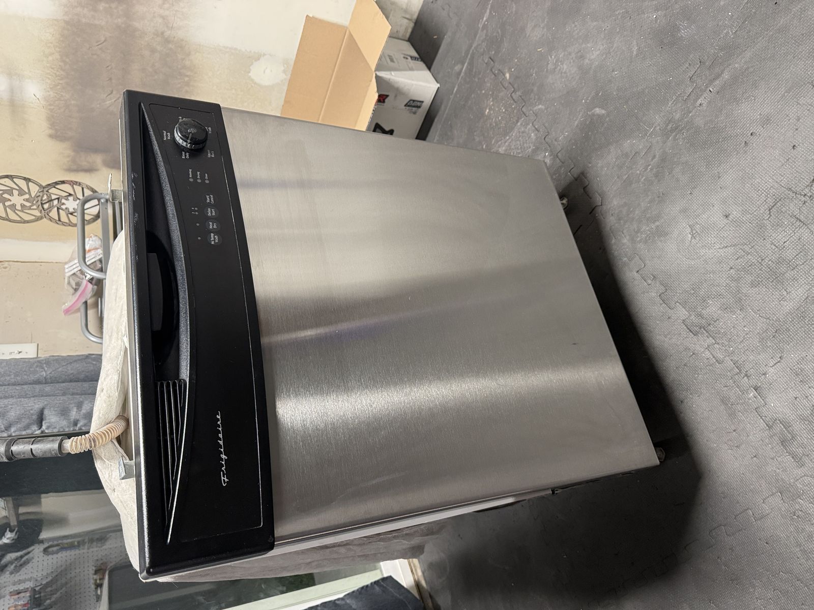 Frigidaire Dishwasher: Stainless steel front, standard 24". Includes drain hose and clips.