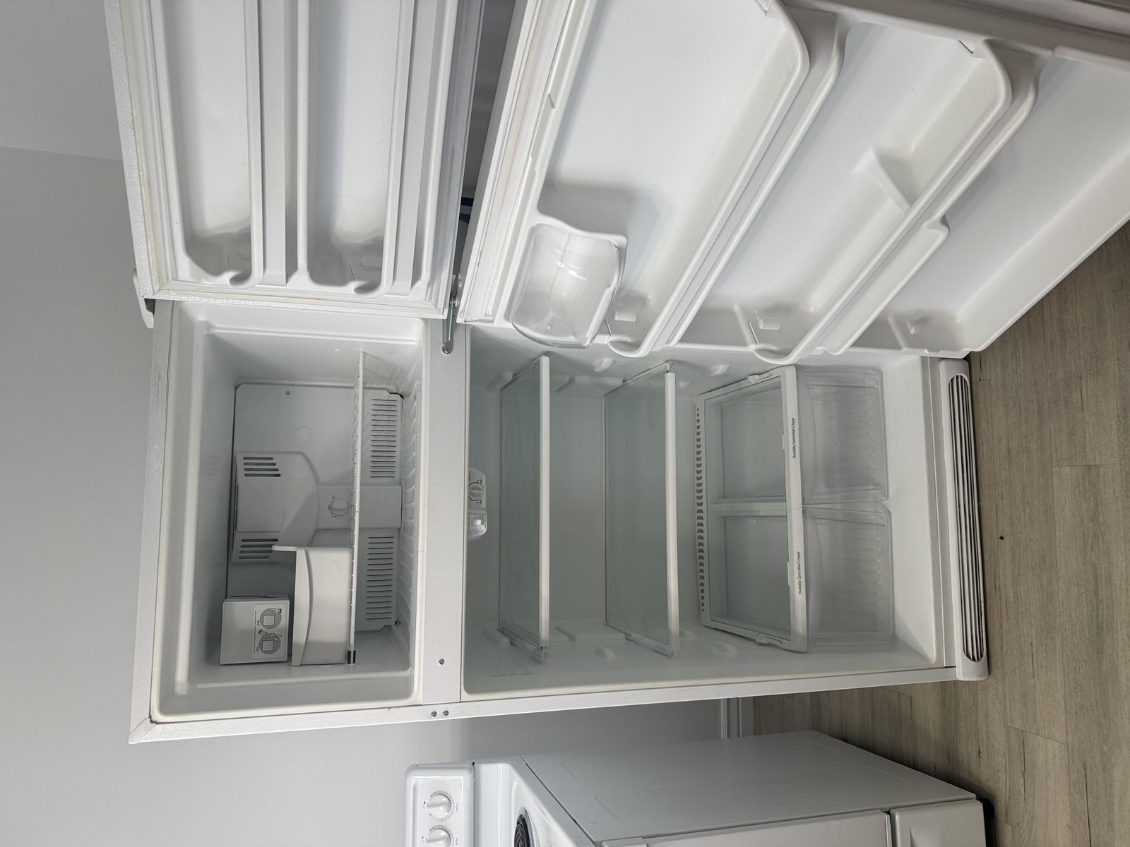 Refrigerator: White top-freezer unit. Very clean, adjustable glass shelves.