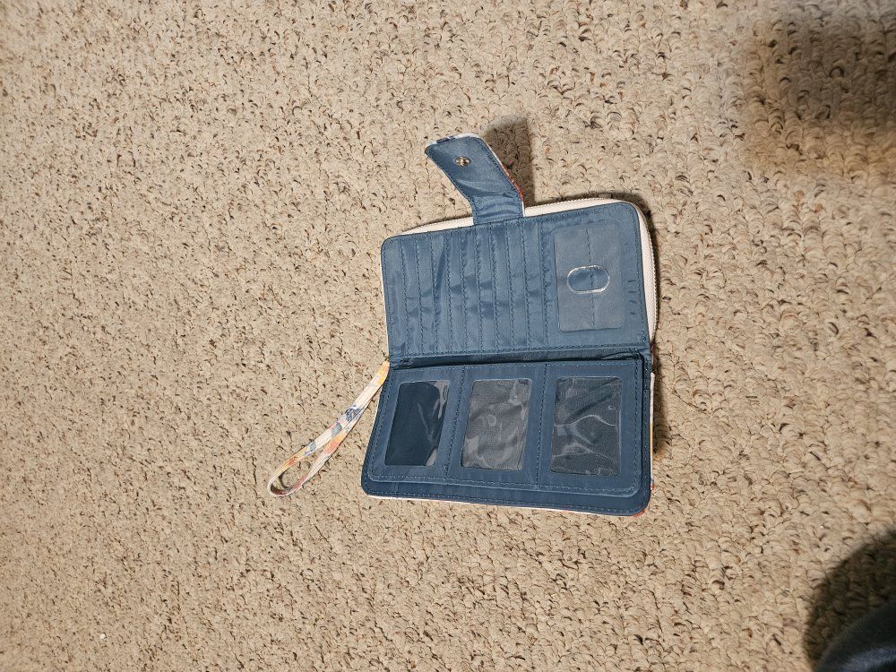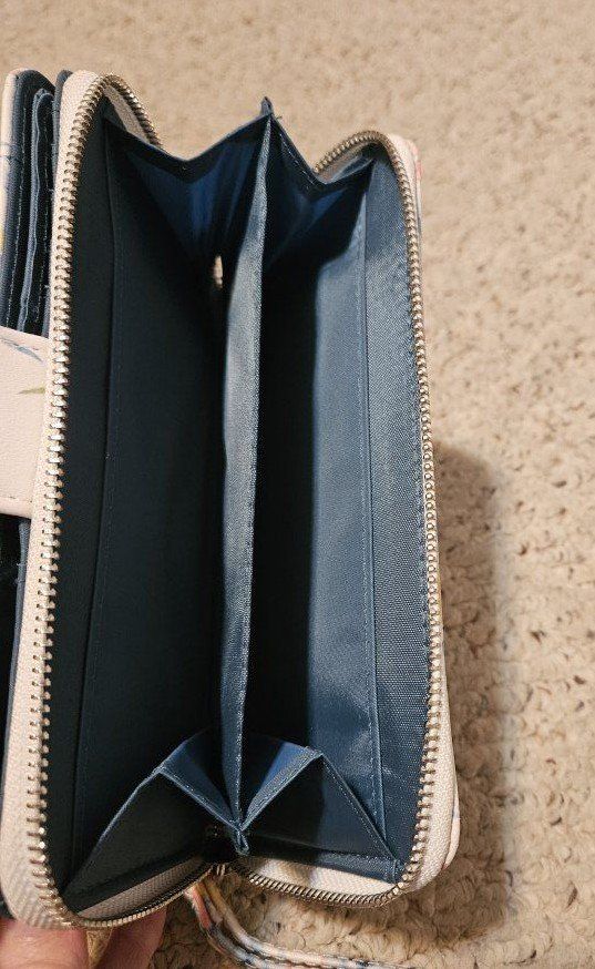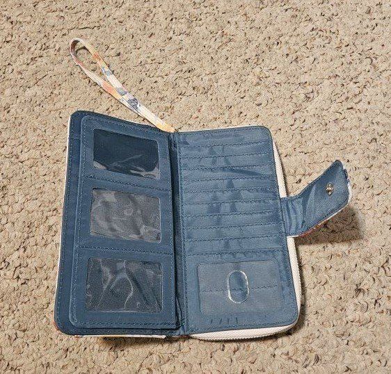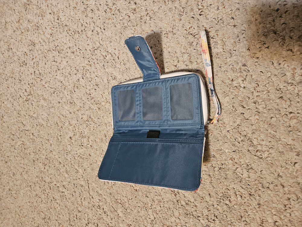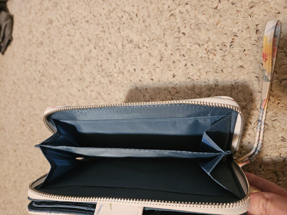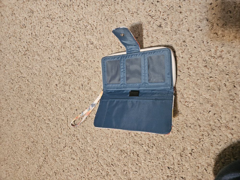 VenmoWomens purse clutch Used, good condition. Front pocket with snap closure, inside snap closure- 16 pockets for credit cards etc., 2 long pockets. Inside zip closure- accordian pocket with divider to make 2 pockets but there's also side pockets as well so 4 long pockets. Back pocket with zip closure. Outside of purse is white with pink and yellow flowers, inside is dark teal.