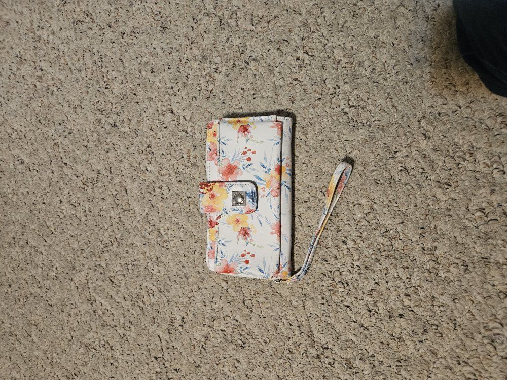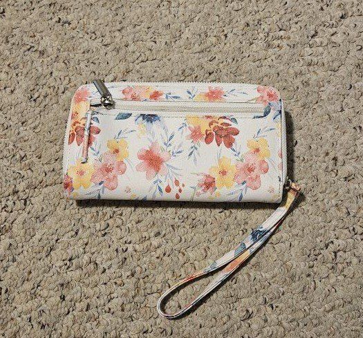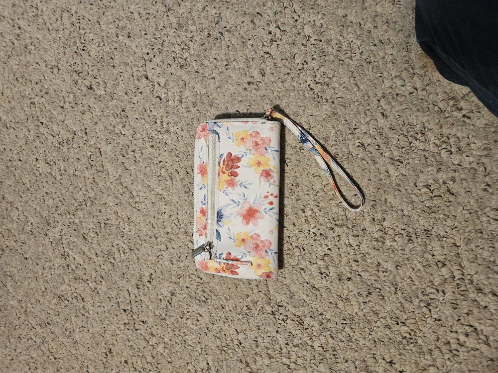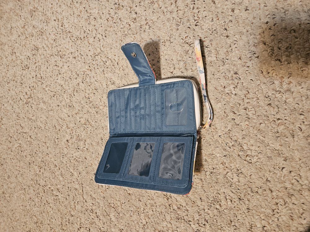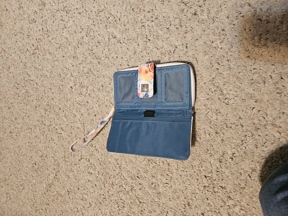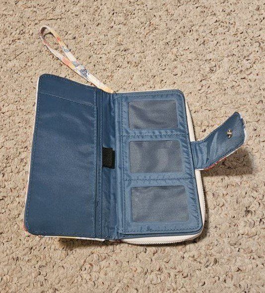 VenmoWomens purse clutch Used, good condition. Front pocket with snap closure, inside snap closure- 16 pockets for credit cards etc., 2 long pockets. Inside zip closure- accordian pocket with divider to make 2 pockets but there's also side pockets as well so 4 long pockets. Back pocket with zip closure. Outside of purse is white with pink and yellow flowers, inside is dark teal.