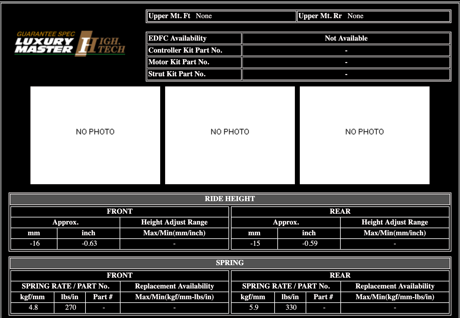 Front: -16mm (-0.63") @ 4.8kg or 270 lbs/in Rear: -15mm (-0.59") @ 5.9kg or 330 lbs/in