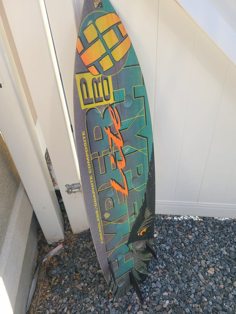 Wakeboard with adjustable bindings, but doubles as surf board skurfer board, lake surfboard. Bindings can be on to get the hang of it or remove when you want to surf. Has 3 fins on bottom.