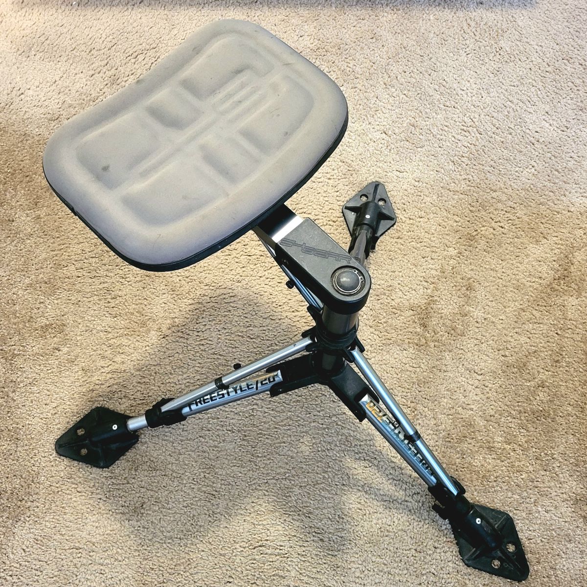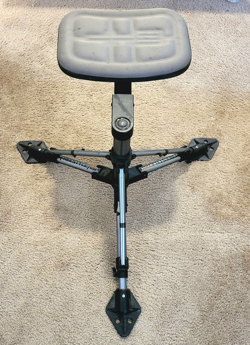 It features a large tripod footprint for stability on uneven ground and a cantilevered seat for high-rotation, long-duration comfort in blinds.