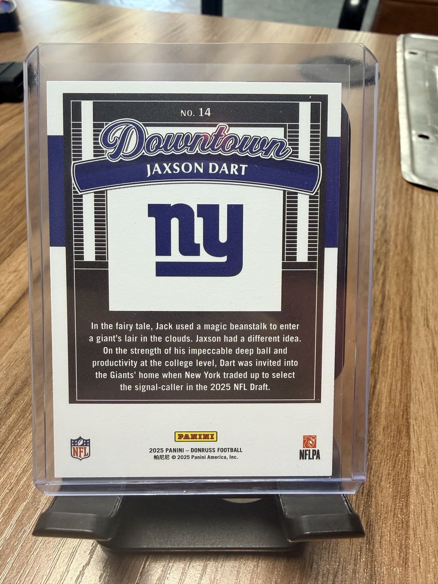 Up for sale is a highly sought-after Downtown! insert featuring rising QB Jaxson Dart from the 2025 Donruss set.