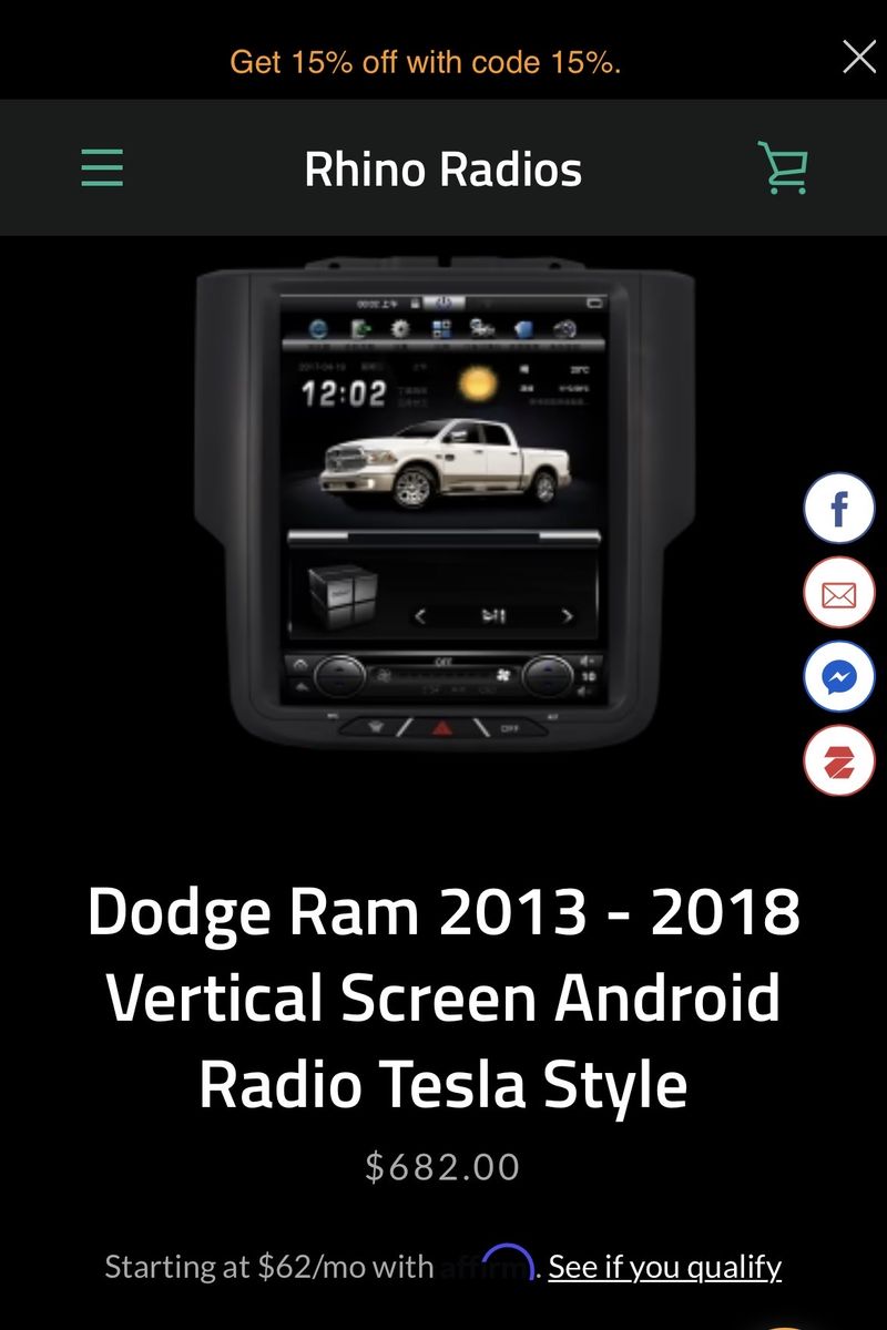 Venmo2013-2018 Dodge/Ram Tesla Style Touchscreen. This will fit any 4th gen model truck. Comes with all the cords needed. They retail for about double. It’s brand new. $300 obo. Message me or text me for questions.