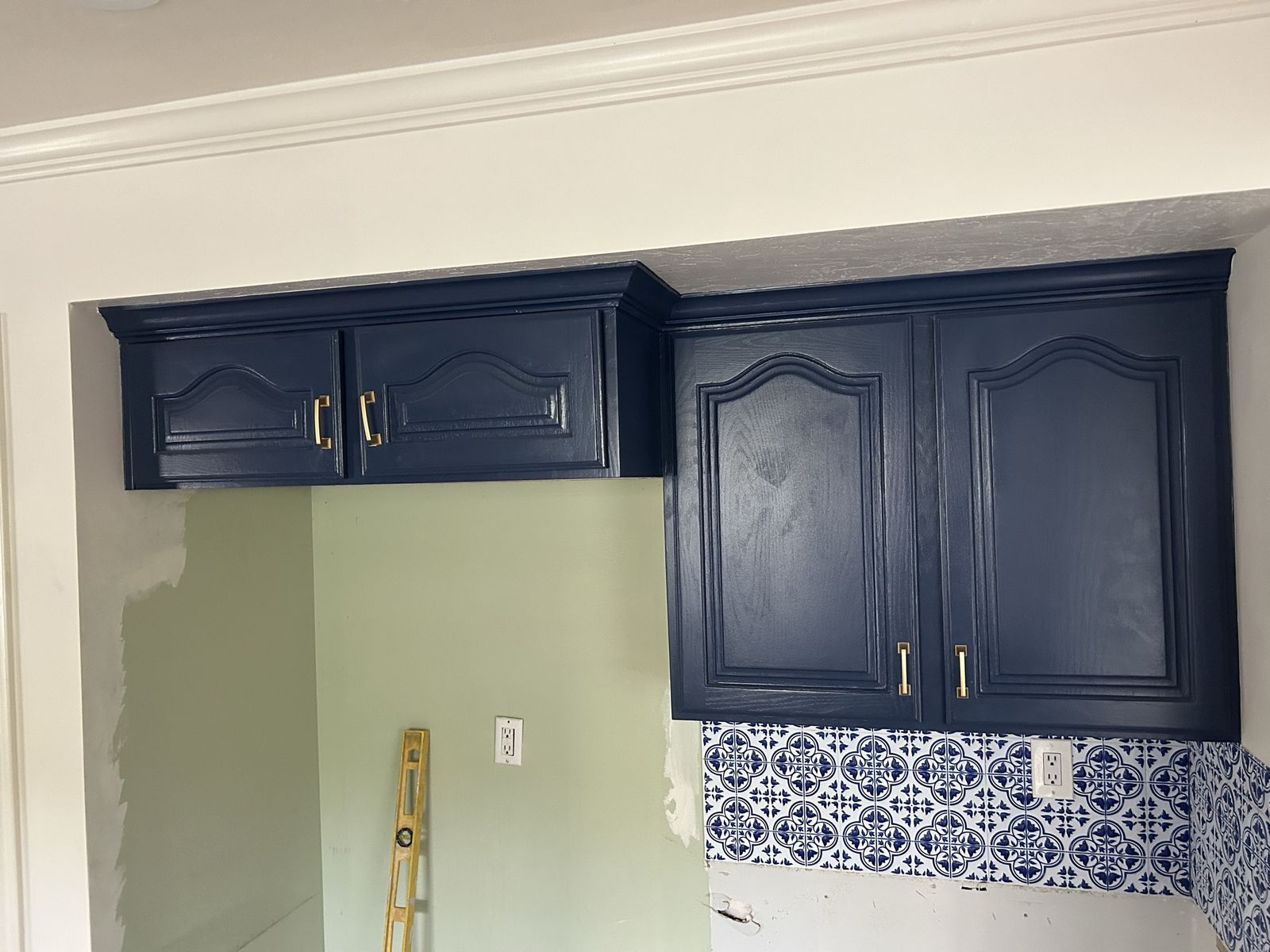 ZelleRecently remodeled upper cabinets. Hardwood Oak frames and doors that have been sanded, filled in and painted so you would never know they are oak. Plywood boxes in good shape and recently painted white. Paint is top quality, Sherwin-Williams, pro classic, hardly chips or scuffs, but I will give you a bottle of touchup as well. New gold hardware.