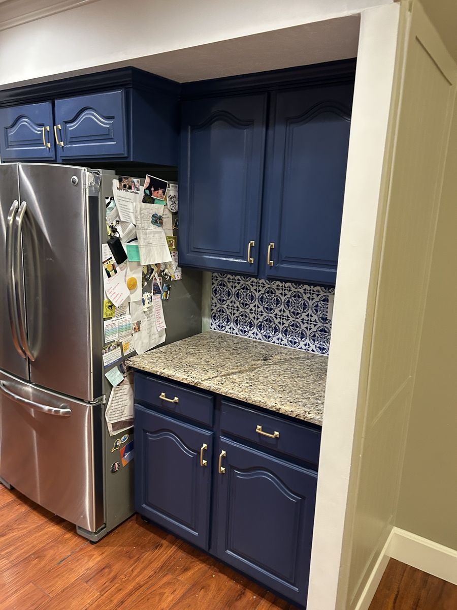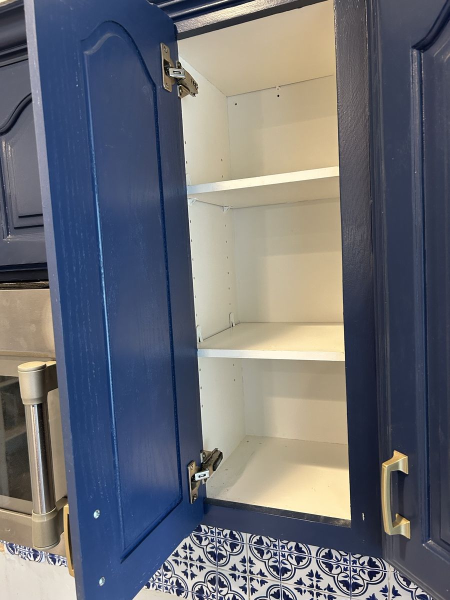 All measurements of cabinets are on the outside of the frames. -Above fridge:38 7/8W x 13H x 24 1/8 D. -Standard: 39”W x 31H x 12 1/8 D -Standard: 42”W x 31H x 12 1/8 D (has extra decorative moulding added on left side. Can be removed). -Standard: 12”W x 31H x 12 1/8 D -Above microwave 30”W x 31H x 12 1/8 D -Standard: 12 1/2”W x 31H x 12 1/8 D (has extra decorative moulding added on right side. Can be removed. -corner: 17 1/2”W front. 33”W inside middle. 23 1/2”D along back, 12 1/8 D along side. -corner: 17 1/2”W front. 33”W inside middle. 23 1/2”D along back, 12 1/8 D along side. (has extra decorative moulding added on right side. Can be removed. Also has spices cabinet built in front).