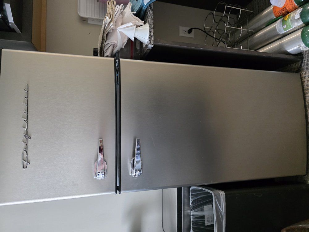Stainless steel apartment refrigerator with freezer. Freezer works great. Almost new.