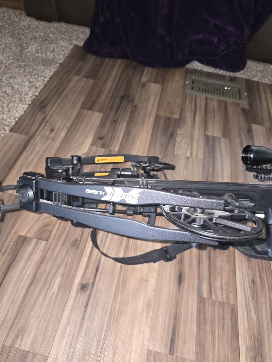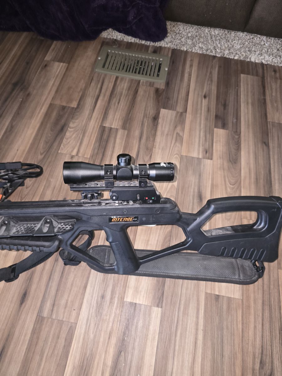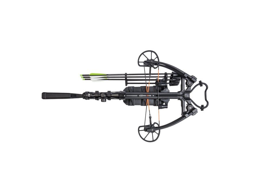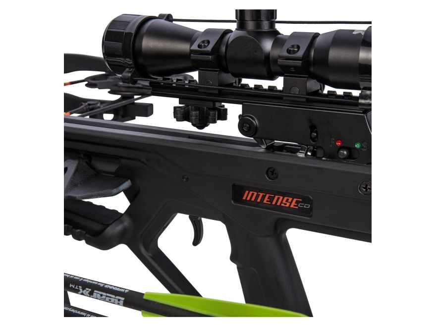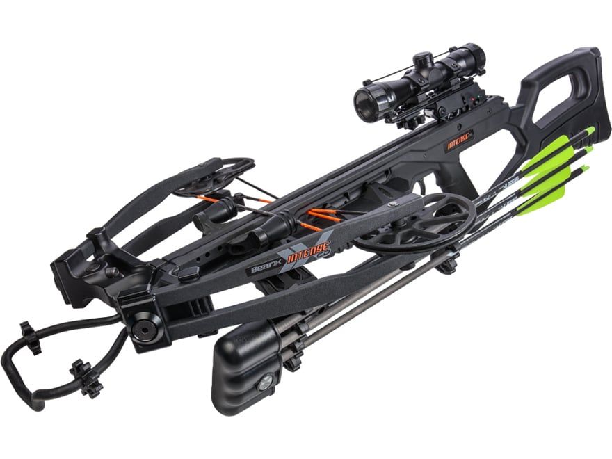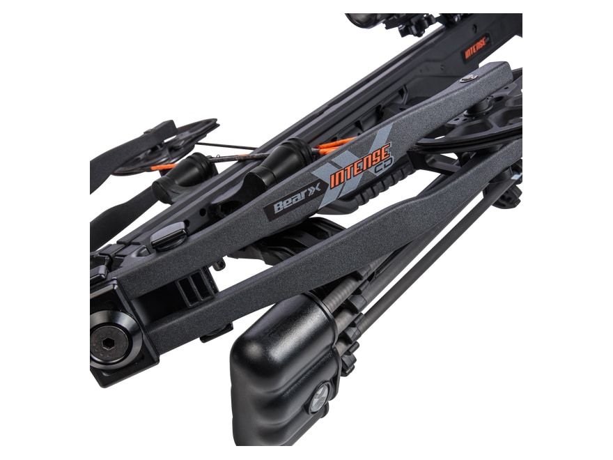 Complete with everything you need to get out into the woods today, the Bear X Intense CD crossbow delivers intensely powerful performance in a compact package. This lethal crossbow measures only 10” wide when cocked and 14” wide when uncocked. Once cocked, the 12.7” power stroke fires arrows at a hard hitting 400 feet per second. This ready-to-hunt crossbow package includes 3 Bear X TrueX arrows, scope, 4-arrow quiver, cocking rope, and rail lube / string wax.