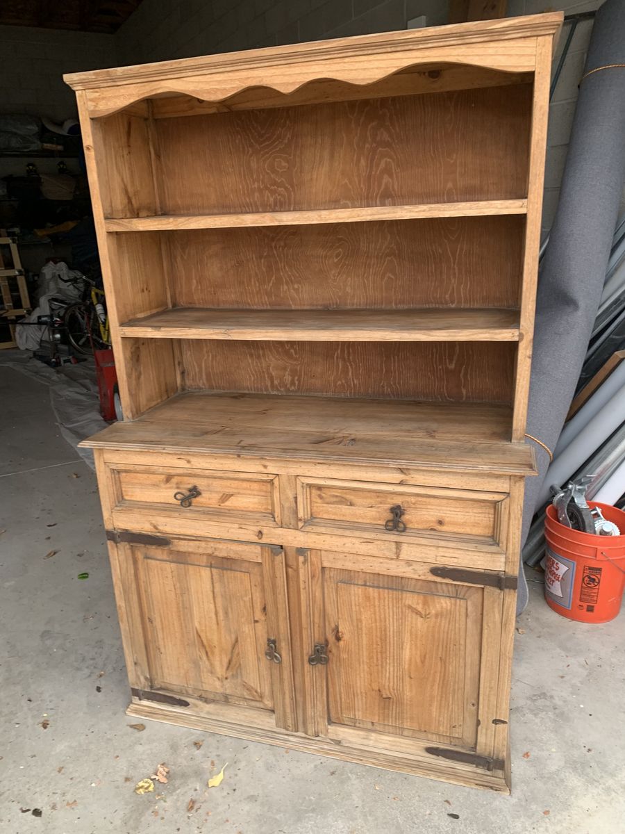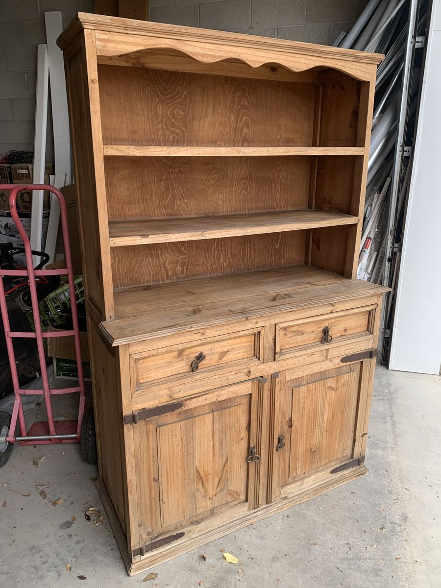 VenmoSturdy/solid wooden hutch including drawers and shelves, even capable of withstanding fluxtuating outdoor temperatures. 70 inches x 46 inches x 24 inches.