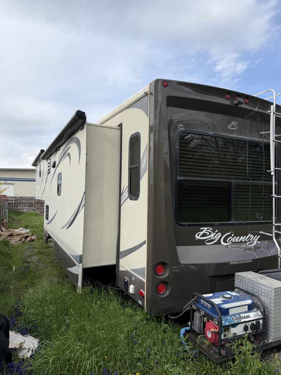 38 foot heartland big country up for sale just in time for the summer fun. 2nd owner, first one was an old man so it’s been very well taken care of and loved. Double door fridge and freezer, 2 ac units that do excellent even in the summer heat. Fireplace and furnace. Brand new roof all the way to the insulation 2 years ago. Everything works as it should and even does well in the cold temps. Has high dollar highway tires that hold up and ride way better than the standard rv tire. I have a valuation from the bank that values it around 26k for a loan. The luggage rack with the tool box and generator that can run the whole trailer can be included for the right price. I’m looking for 20k. I can deliver for a small fee as well. Message me with an offer, questions and more pictures. Thank you!
