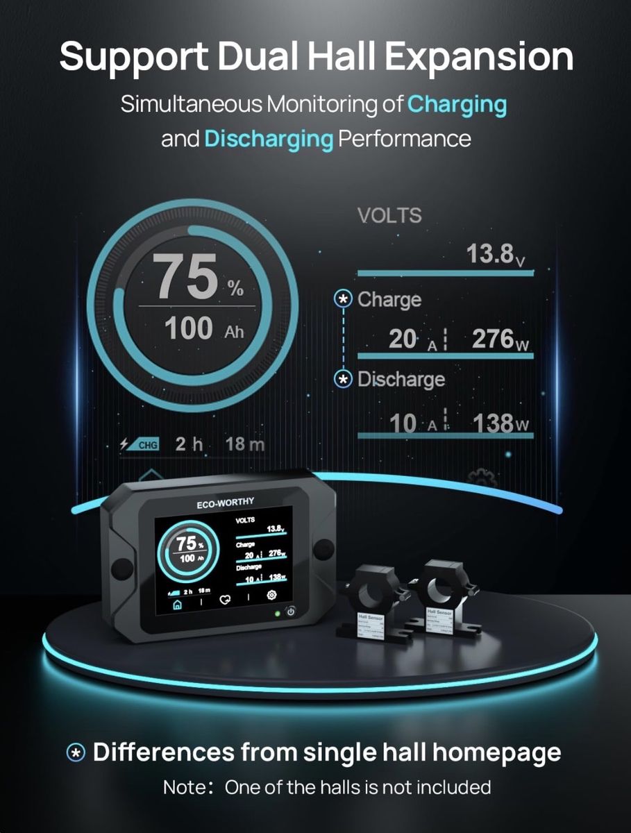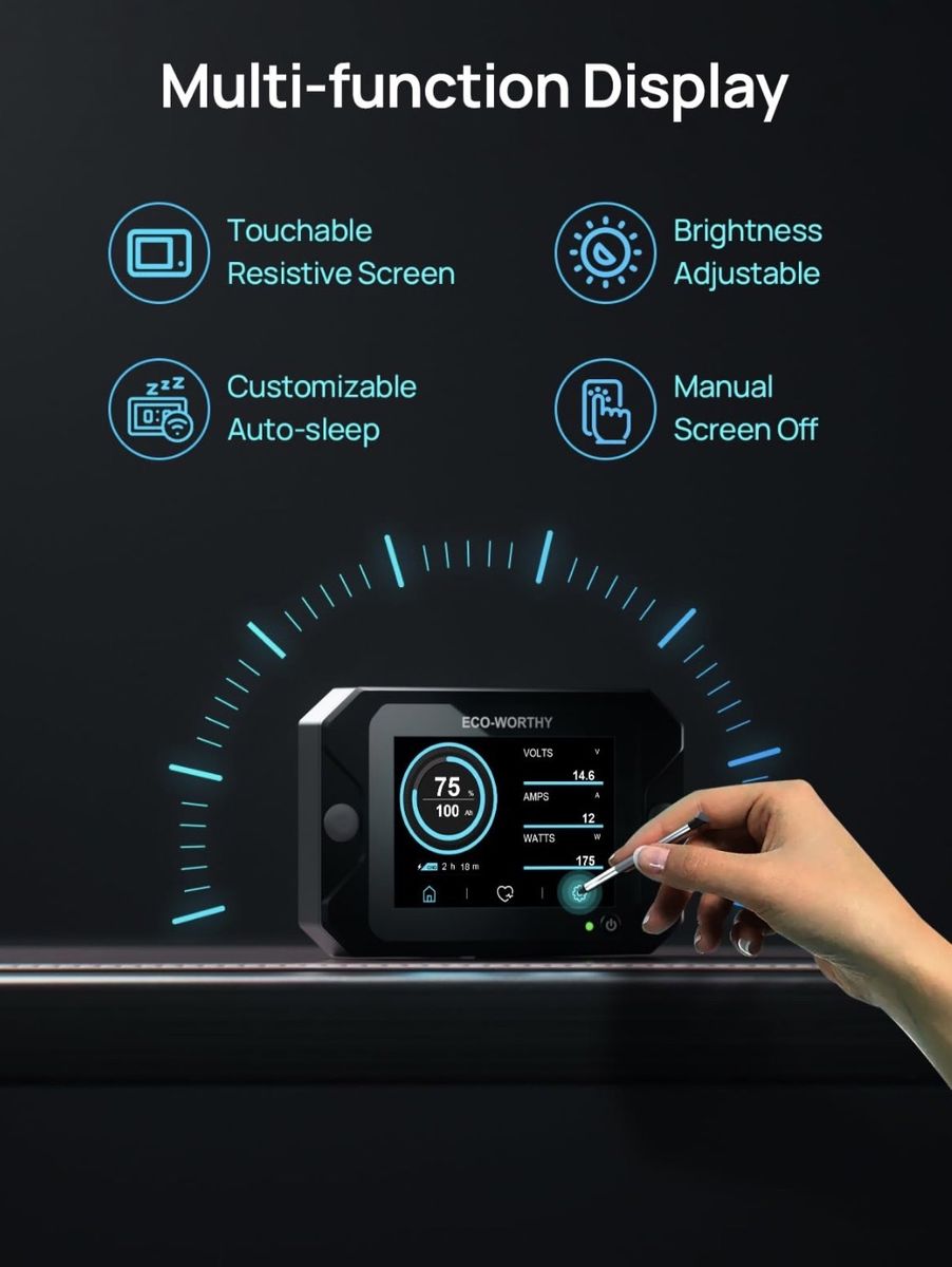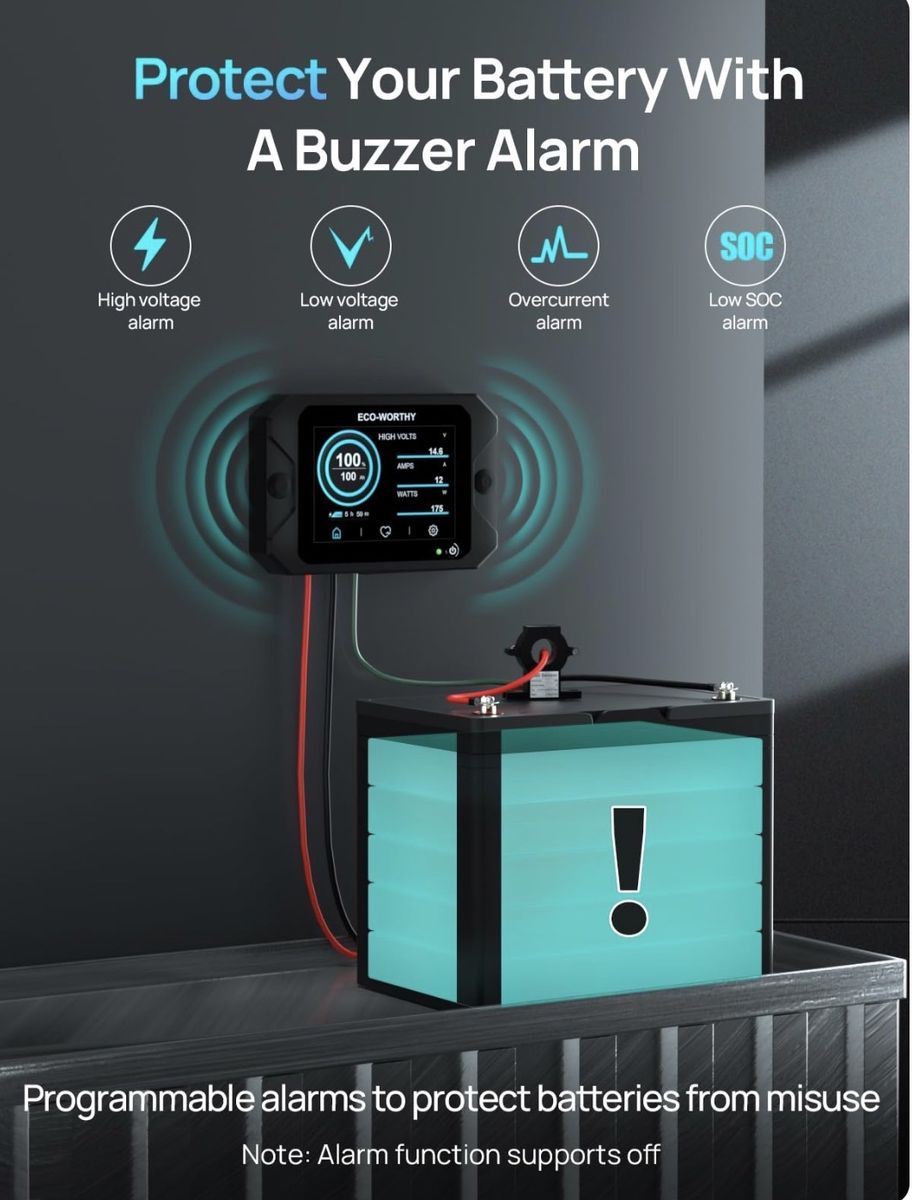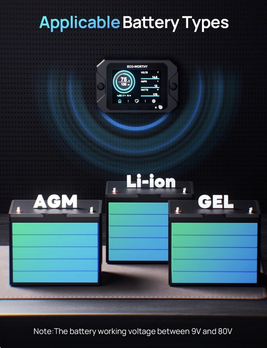 ECO-WORTHY Battery Monitor with Hall Sensor, 300A Touchable Backlight Display with Programmable Alarm for 9-80V LiFePO4/AGM/Gel Battery RV Golf Cart Off-Grid Houses