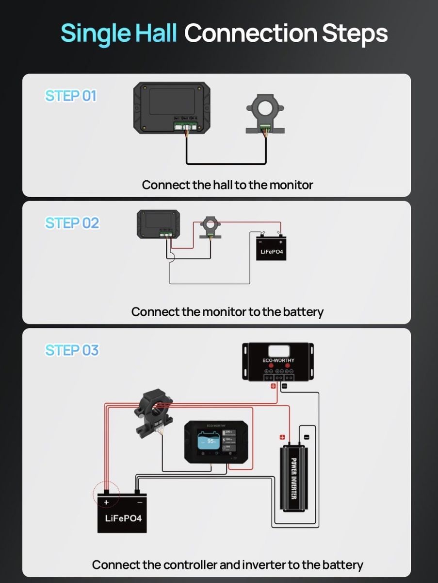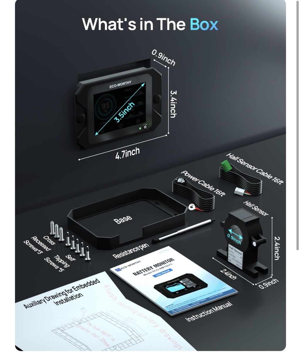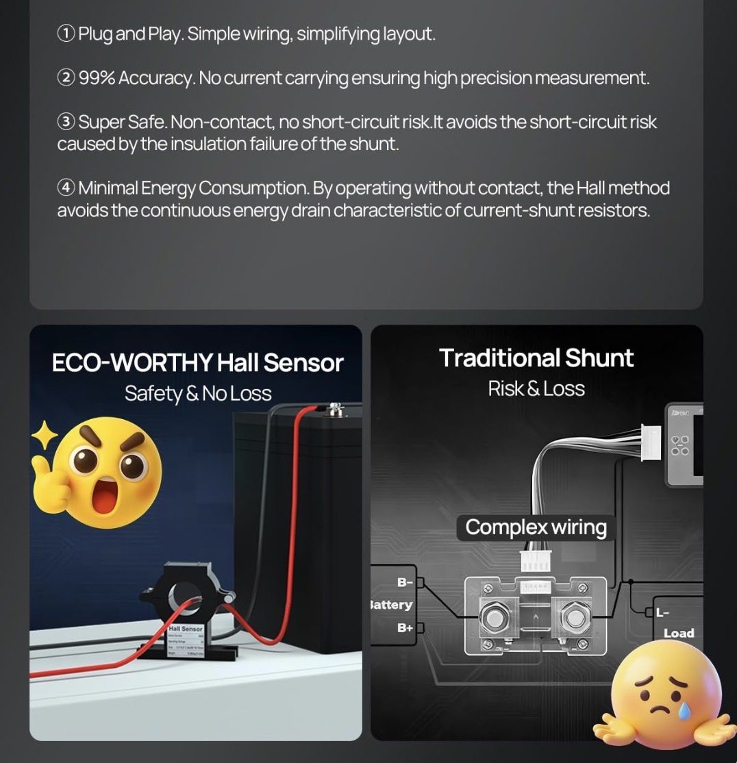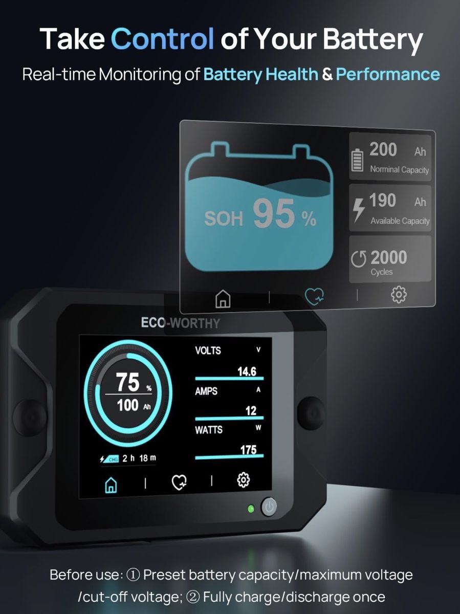 ECO-WORTHY Battery Monitor with Hall Sensor, 300A Touchable Backlight Display with Programmable Alarm for 9-80V LiFePO4/AGM/Gel Battery RV Golf Cart Off-Grid Houses