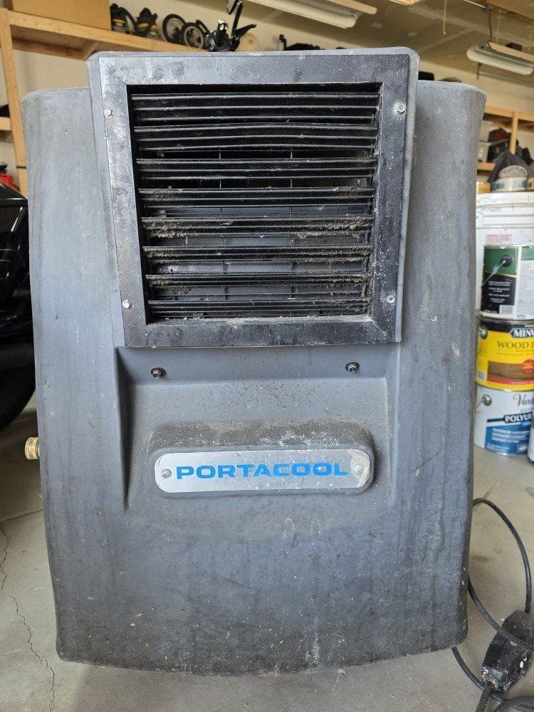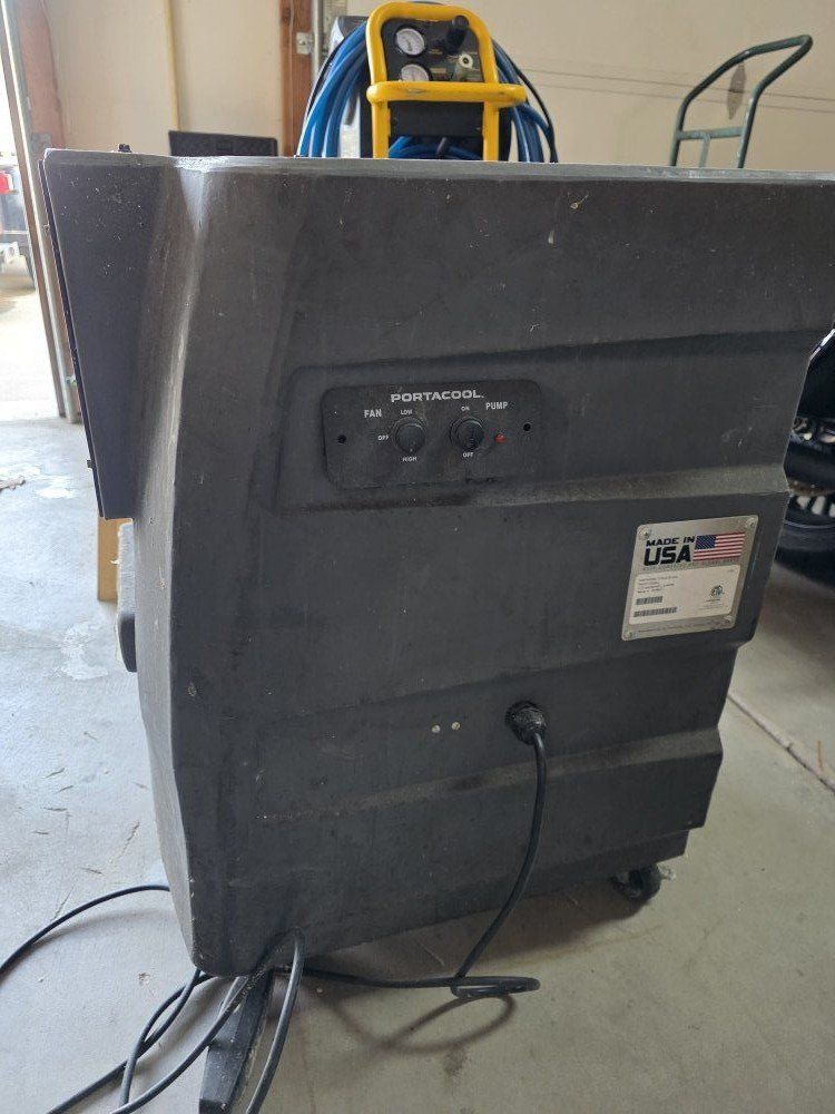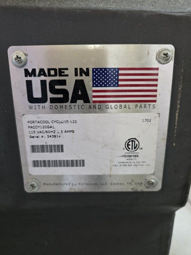 made in the USA portacool. model cyclone 120. this air conditioner turns on and blows. it's very dirty from sitting around but it blows. I'm not sure of the condition of the water pump and the pads are missing. these sell new for $700.00 plus tax.