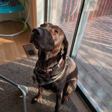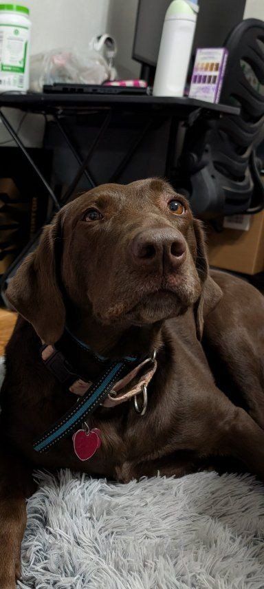 This is a 6.5 year old spayed female chocolate Labrador. \