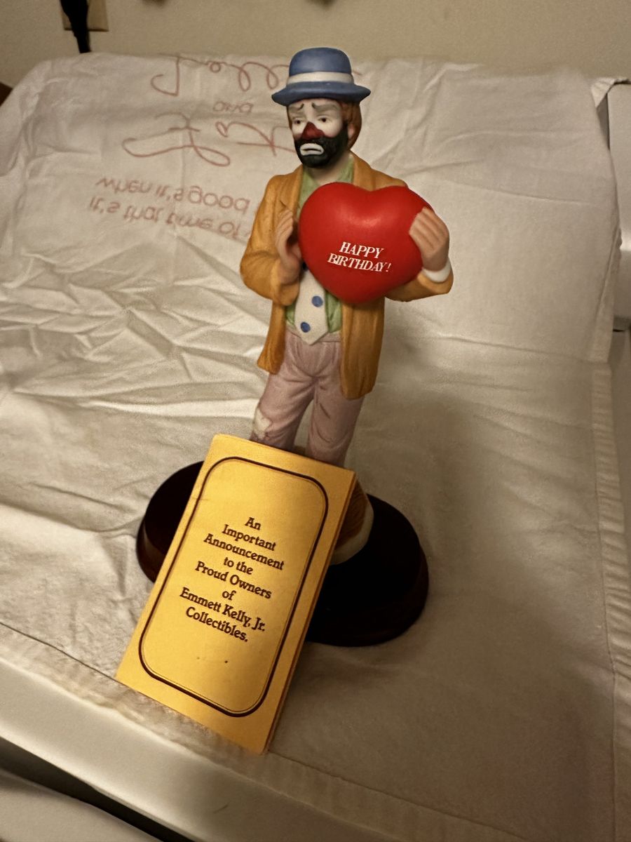 Vintage Emmett Kelly Jr clown figurine holding a “Happy Birthday” heart. Features the classic Weary Willie character.