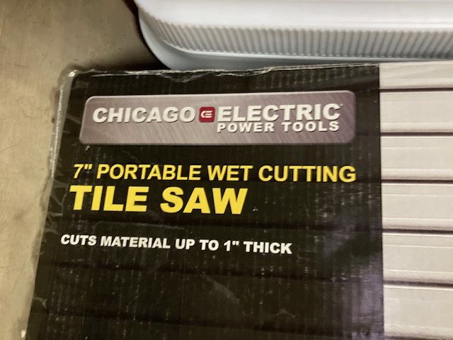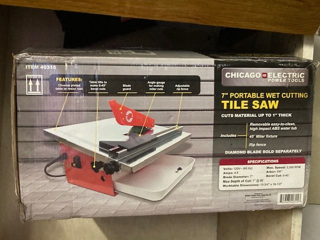 New Chicago Electric 7" Portable Wet Cutting Tile Saw. Brand New. Has never been used. Cuts tiles up to 1" thick. Diamond blade sold separately. CASH only.