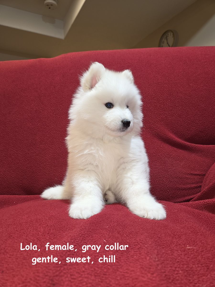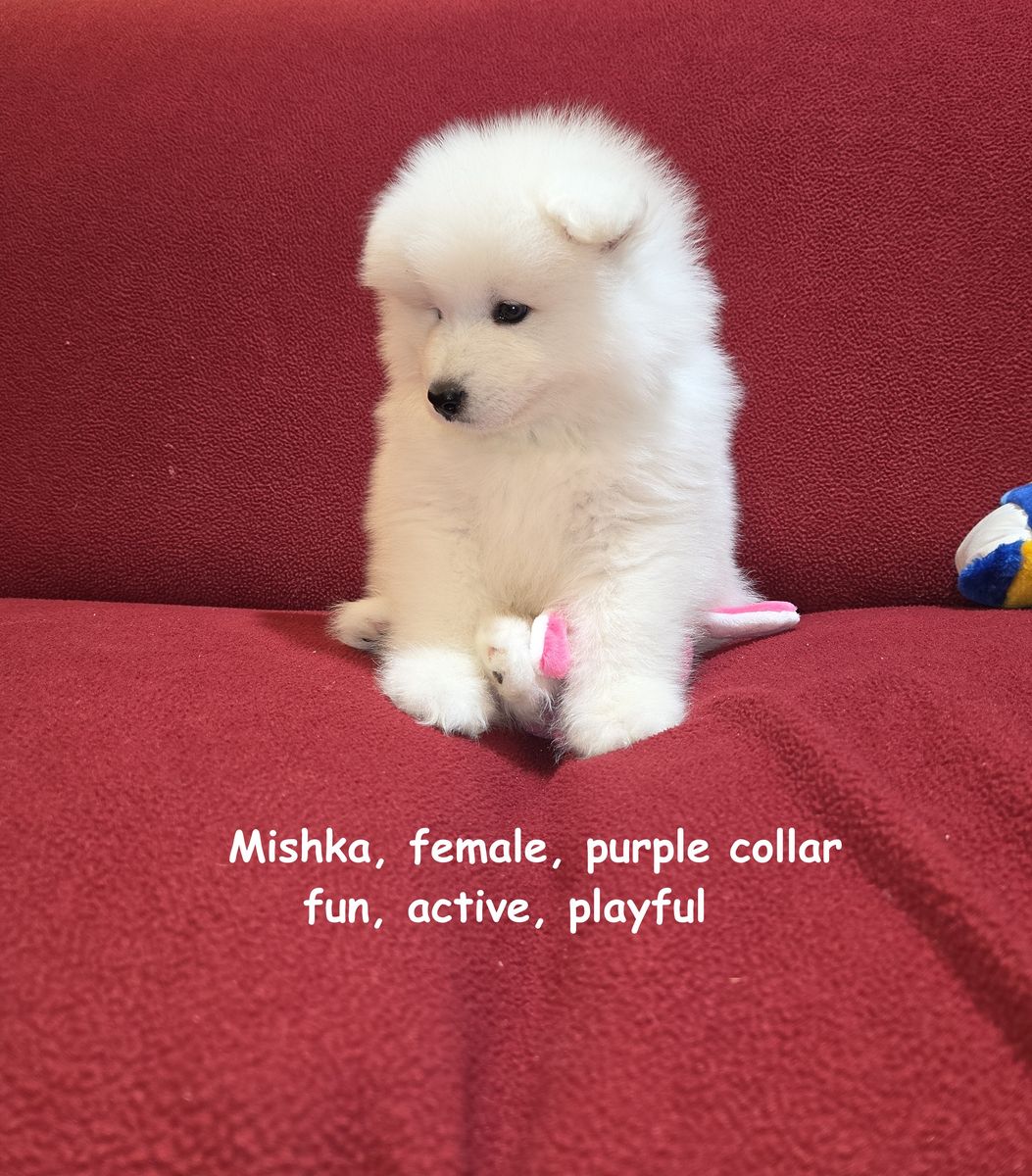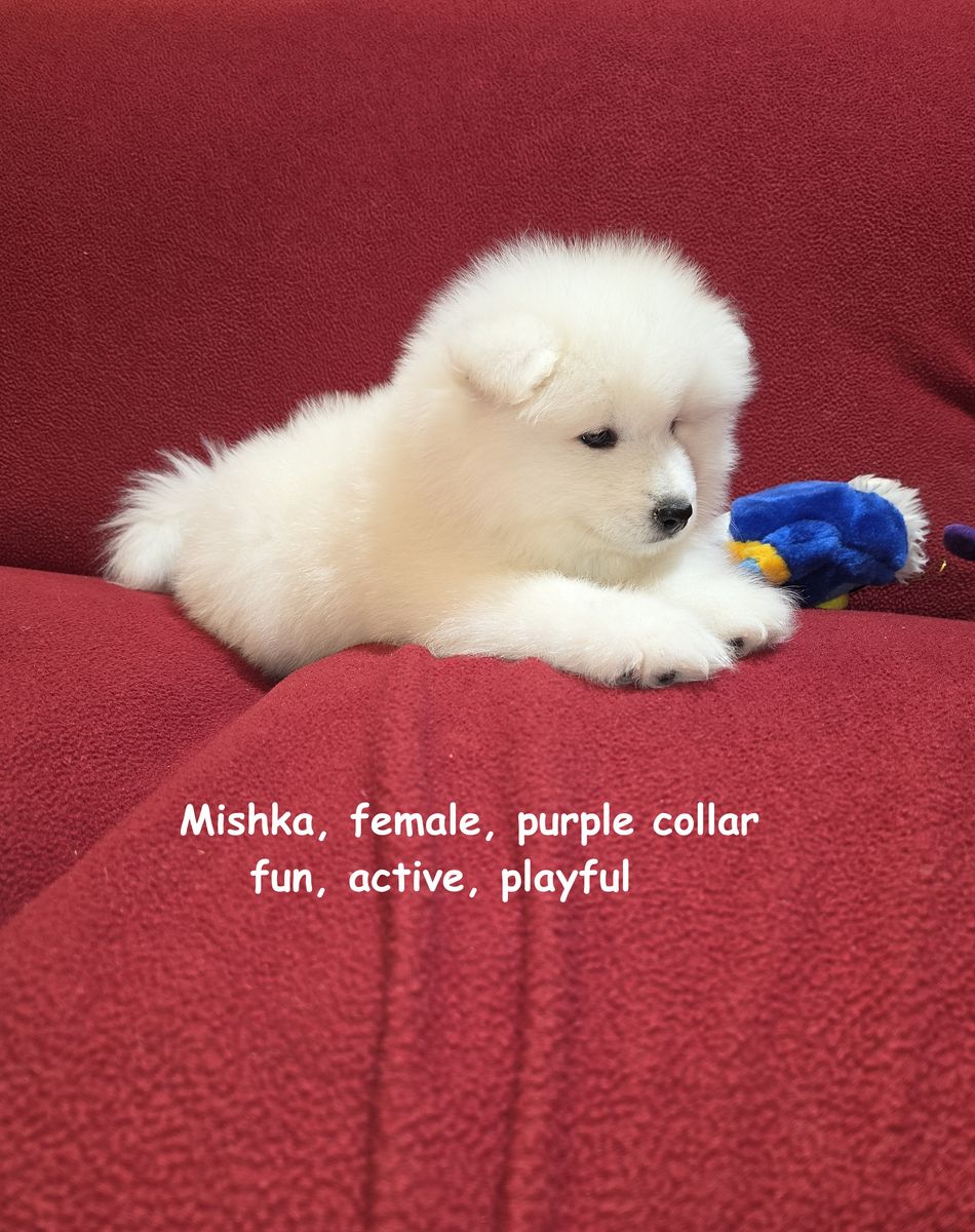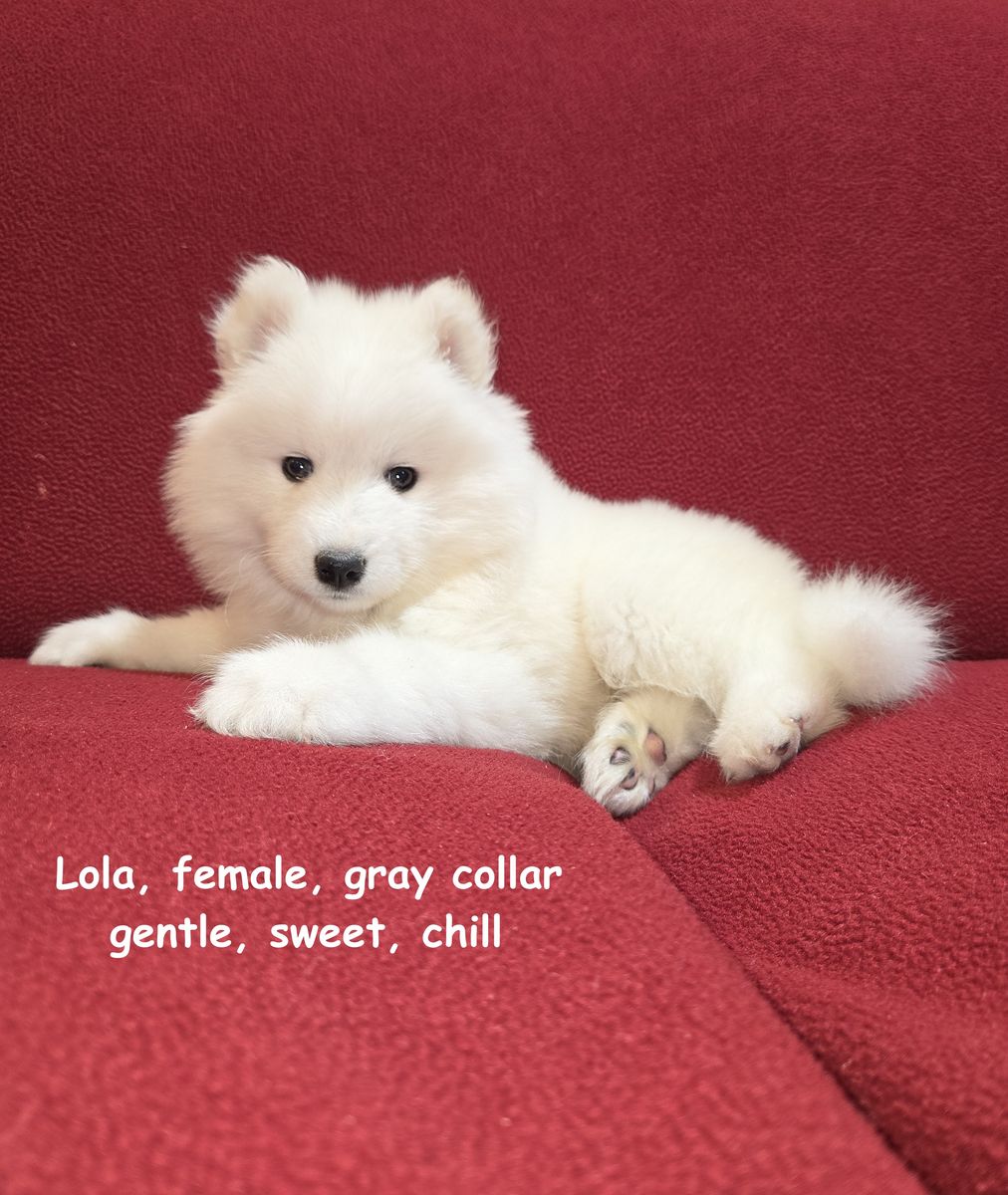 We have been breeding Samoyeds for about 7 years now, and we have never before encountered a litter in which almost all of the puppies were girls. We invite you to visit our home in Centerville to meet the puppies in person and reserve the one you like best.
