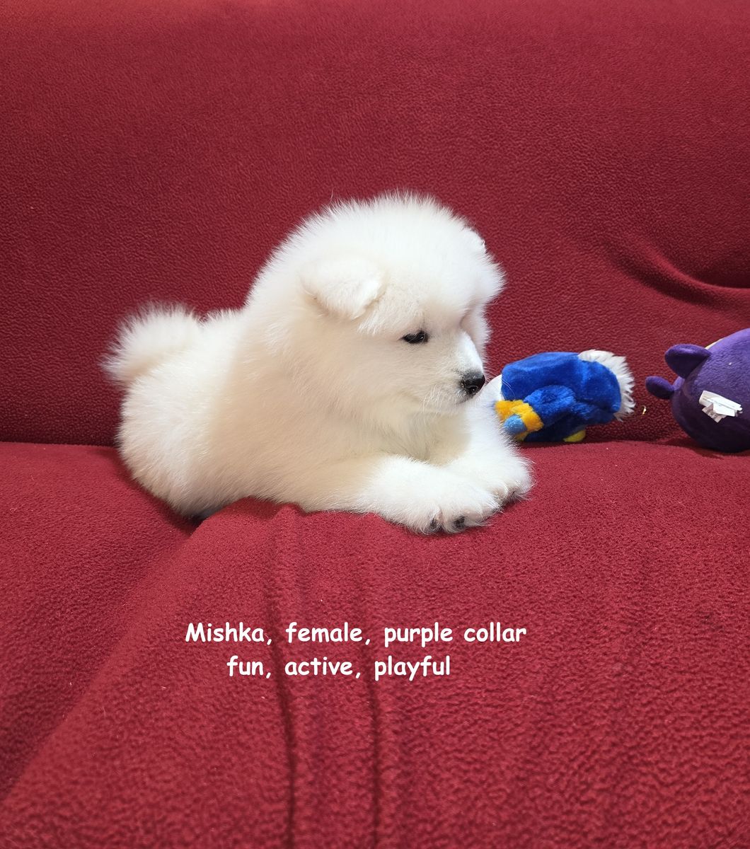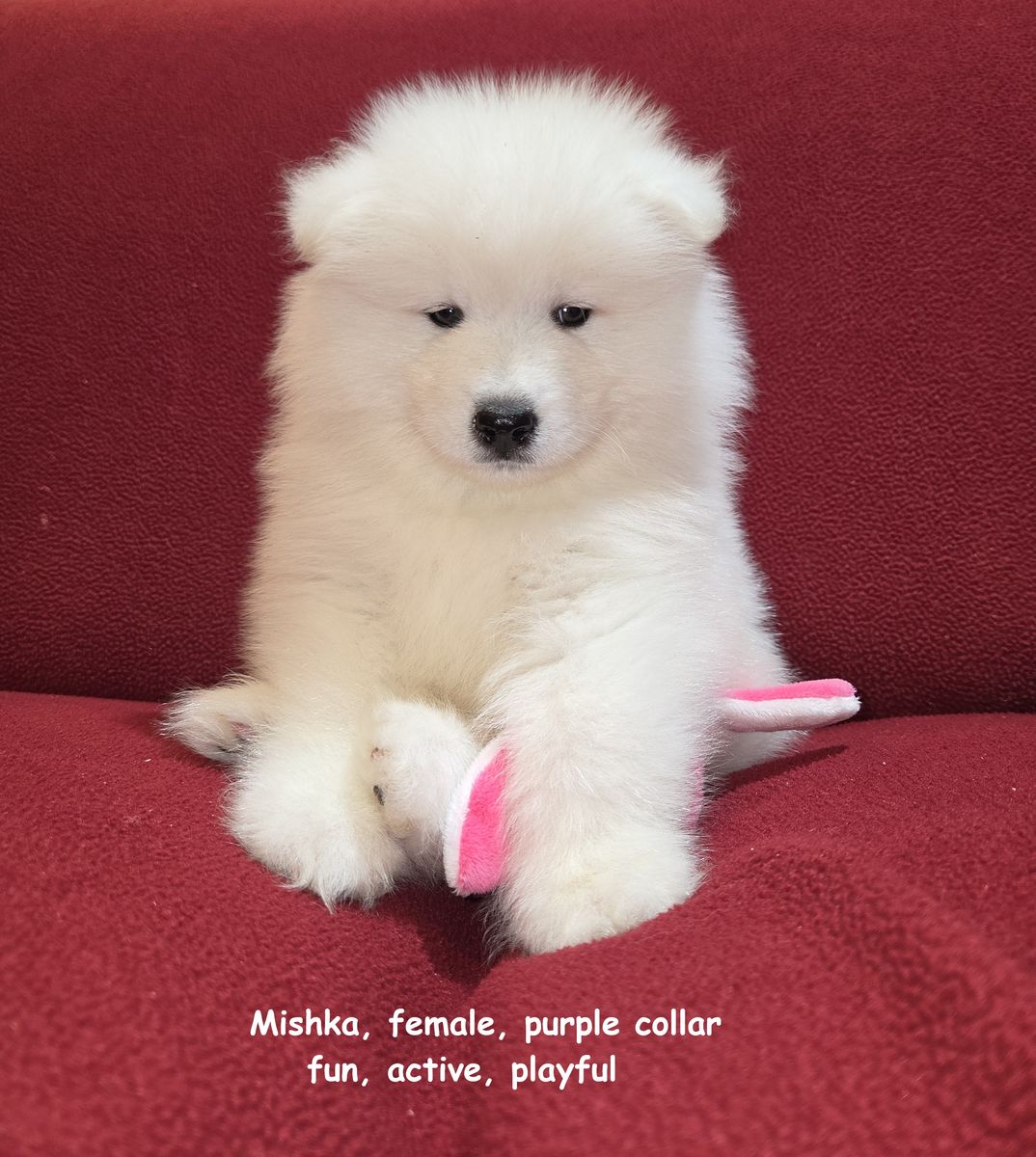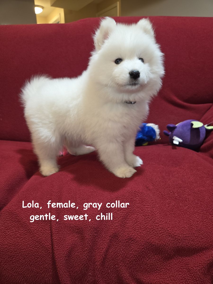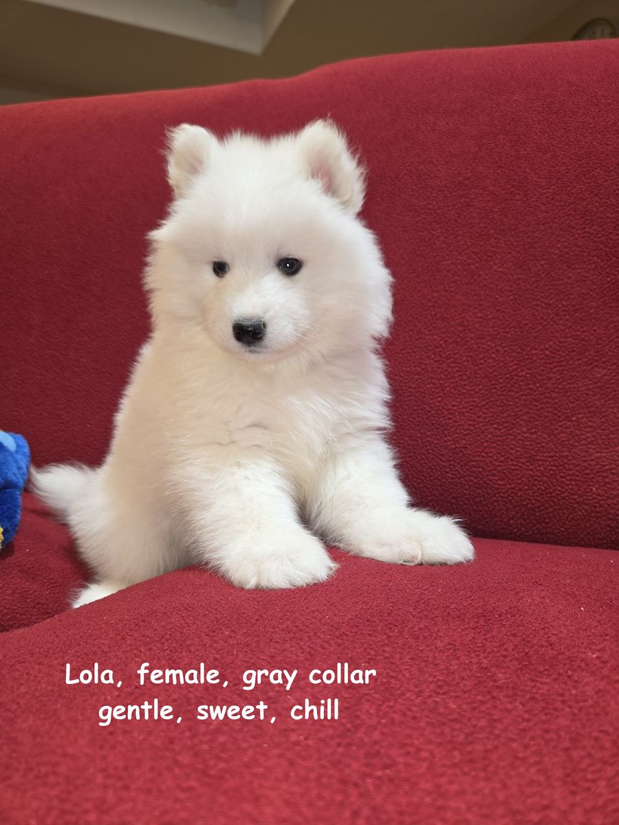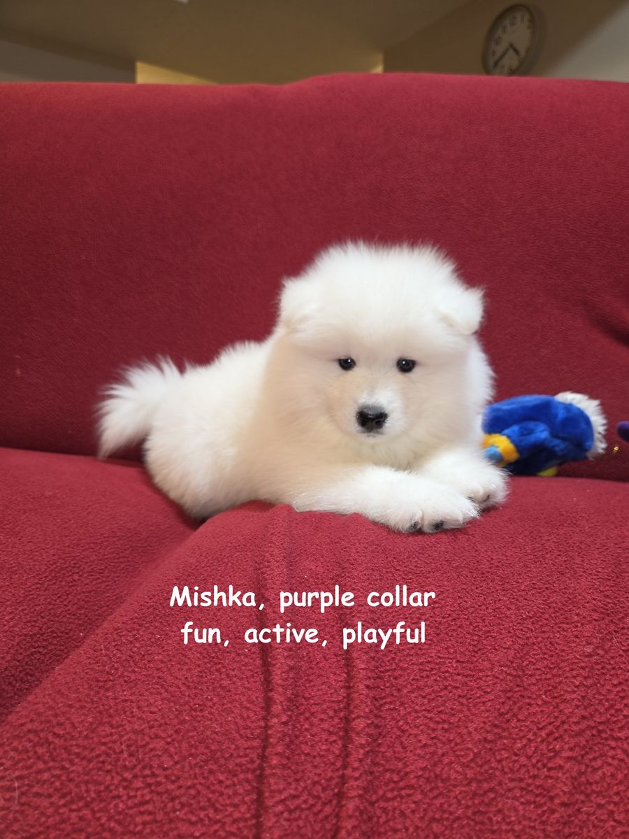 We have been breeding Samoyeds for about 7 years now, and we have never before encountered a litter in which almost all of the puppies were girls. We invite you to visit our home in Centerville to meet the puppies in person and reserve the one you like best.