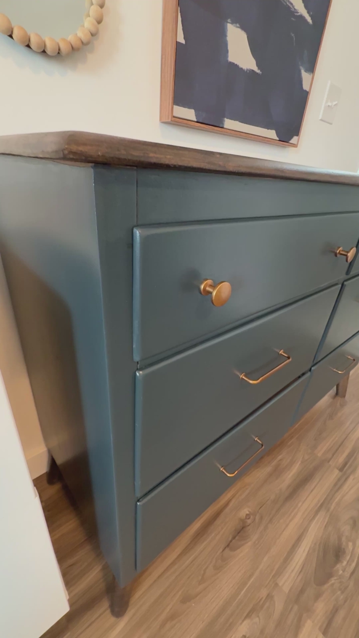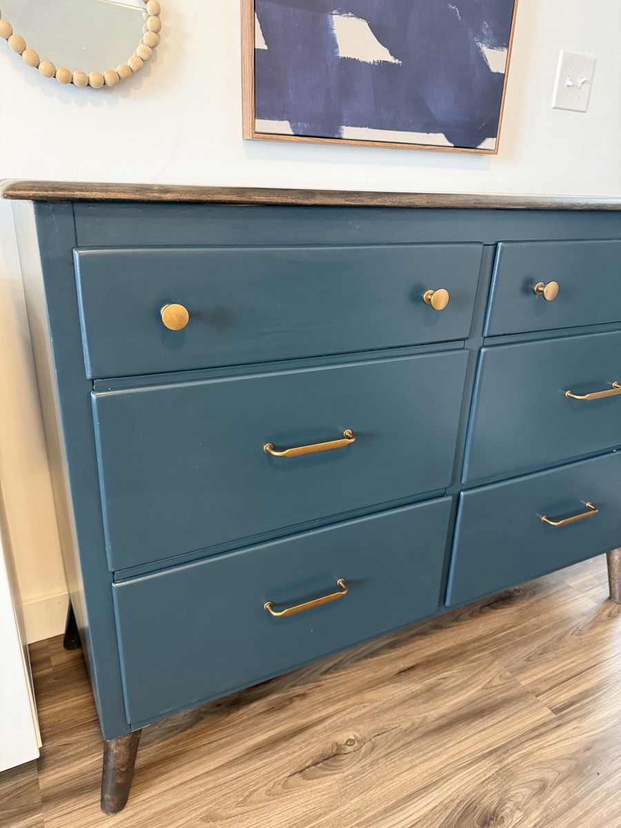 Beautiful six‑drawer dresser in a rich teal finish with brass hardware and a dark wood top. The color adds depth and character while staying versatile enough for any space — bedroom, entryway, or teen’s room.