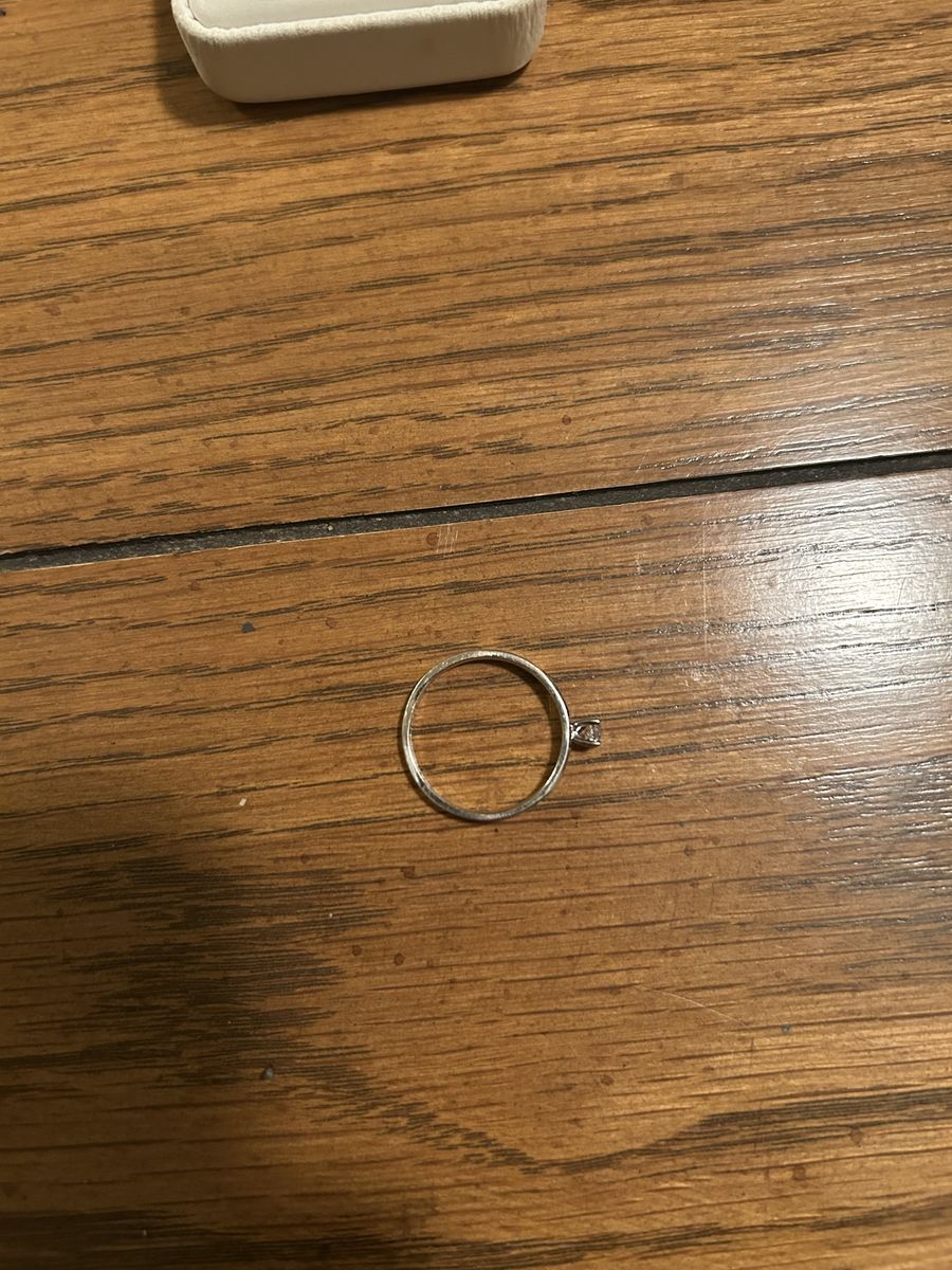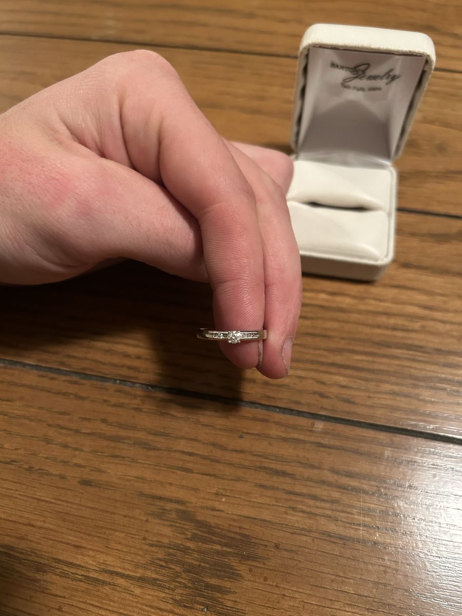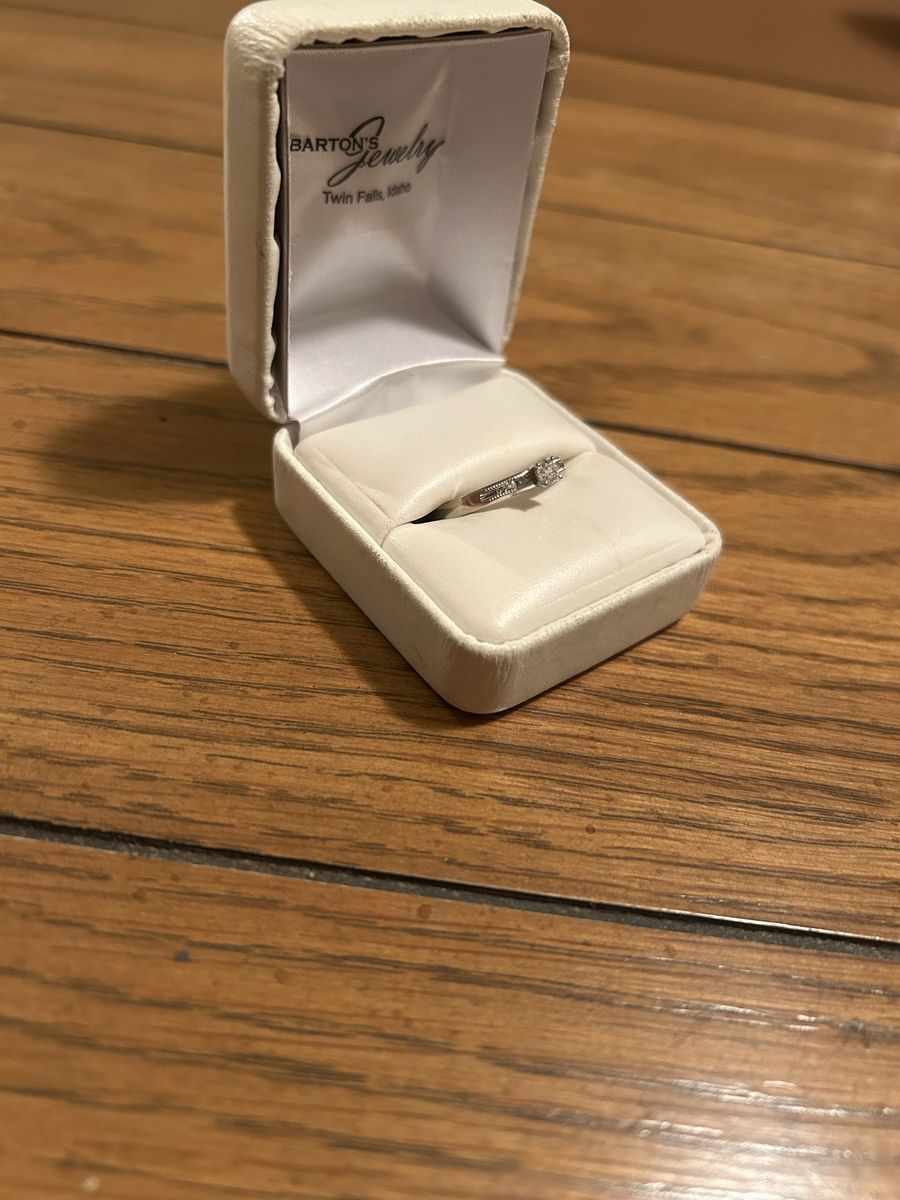 10K White Gold ring with a .15 carat natural diamond center. Has 3 smaller diamonds on each side of the main one. Currently a size 9. I purchased it new in June of 2024 and had very little use in the time I have had it. $450 cash obo