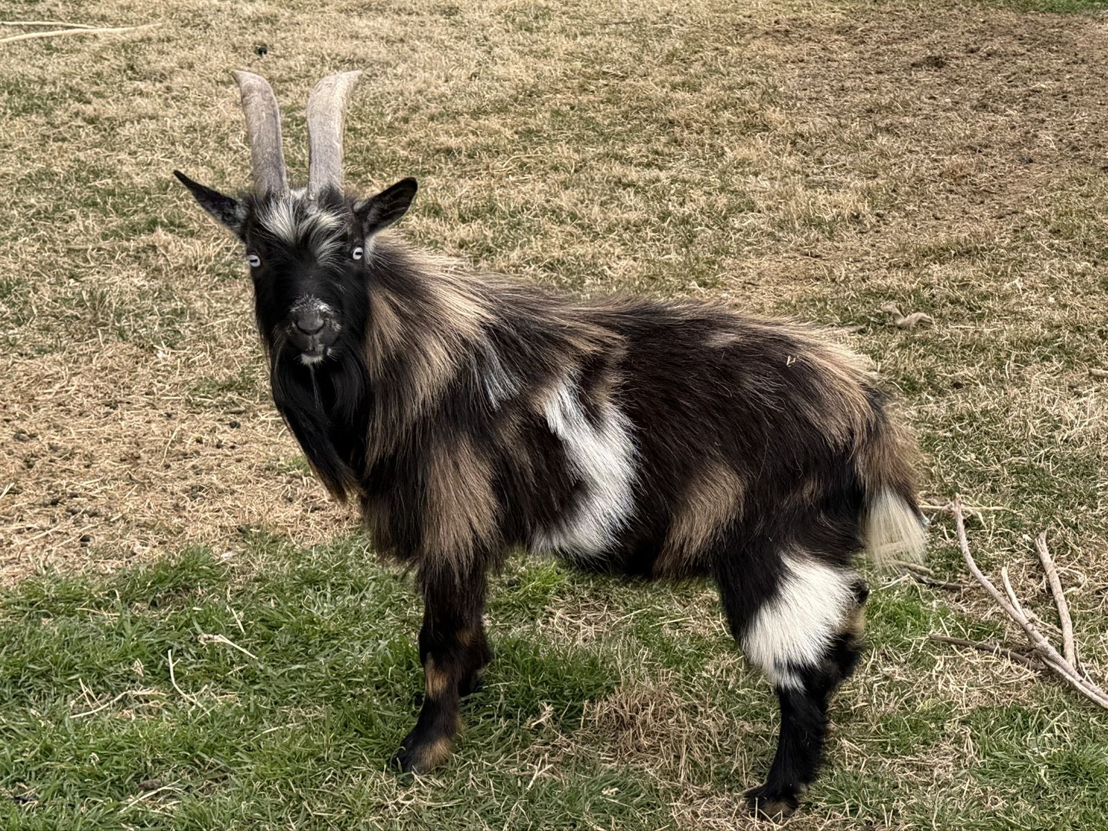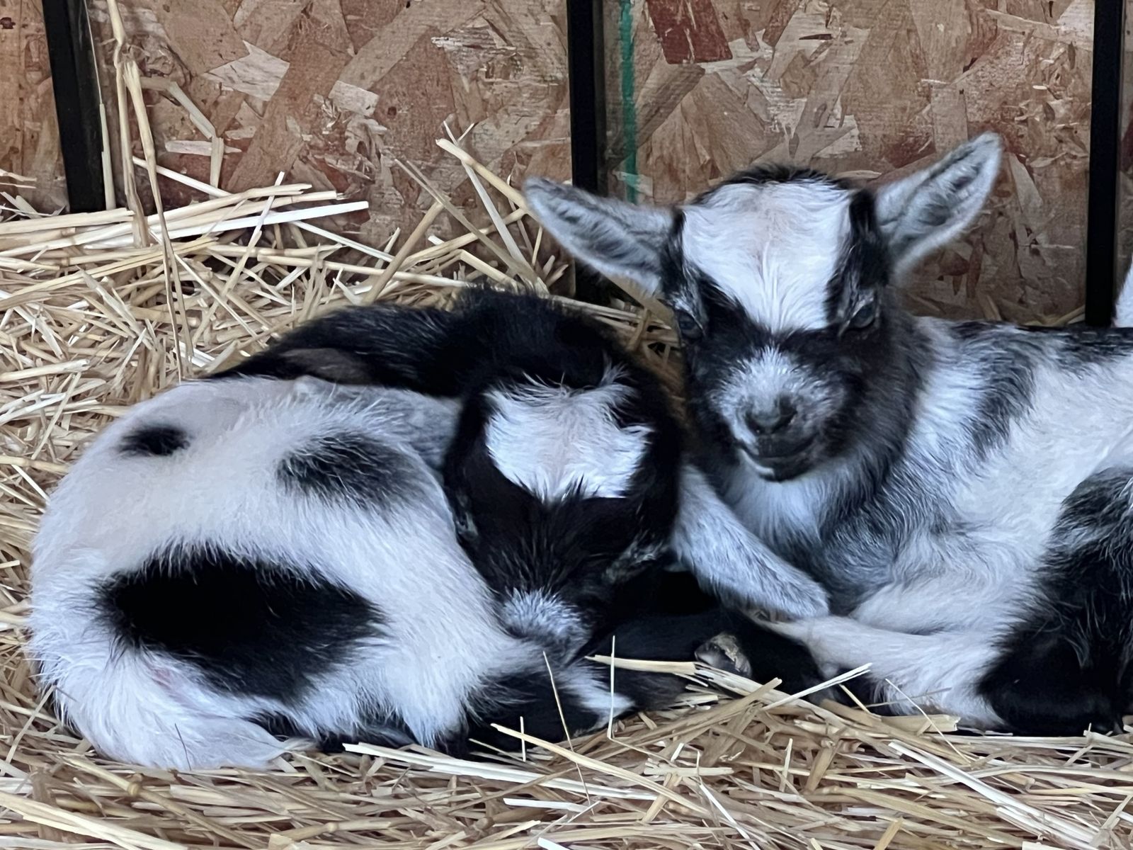 The second doe (Susan) has two babies, one buckling (tricolor) and one doeling (moon spotted). DOB 03/07/26