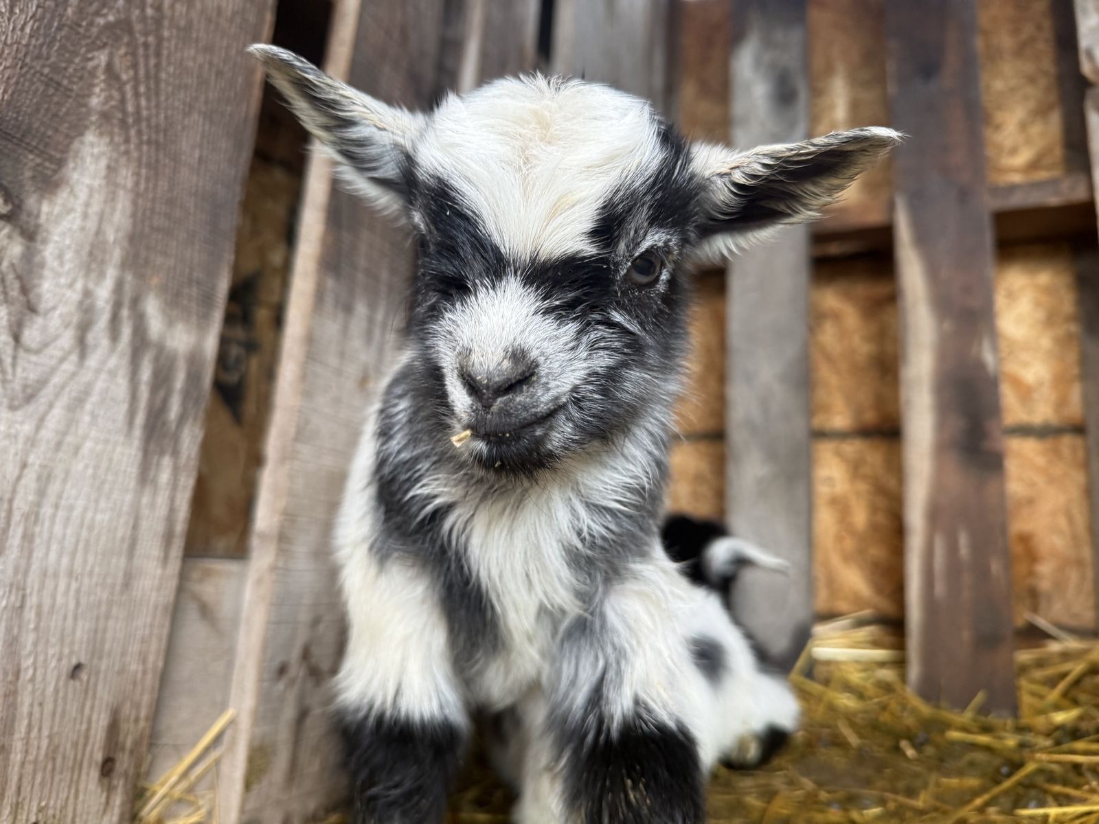 The first doe (Carol) has three babies, one buckling (moon spotted and white) and two doelings (one silver/White and one tricolor). DOB 03/03/26
