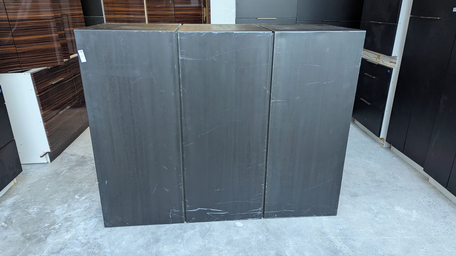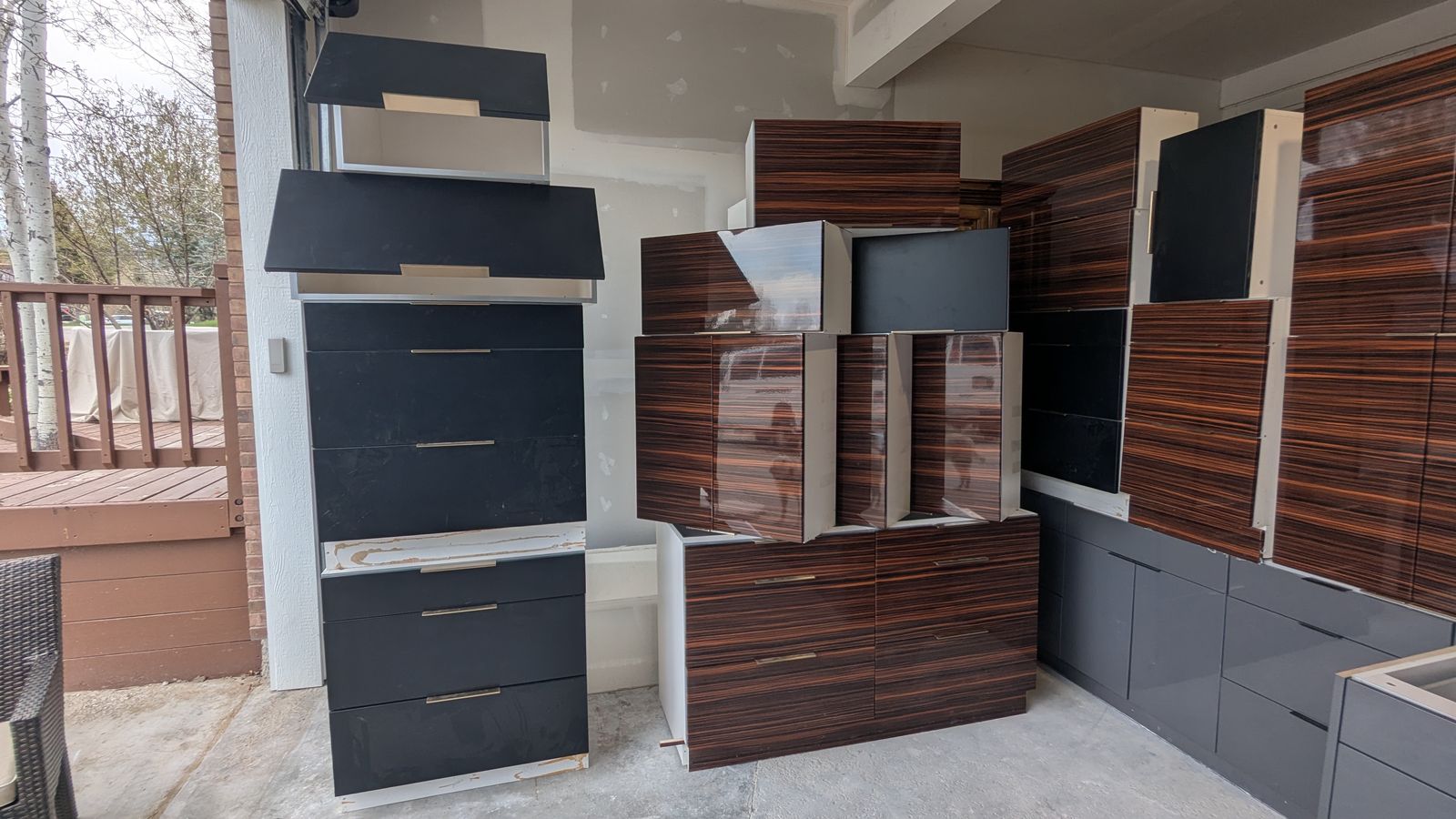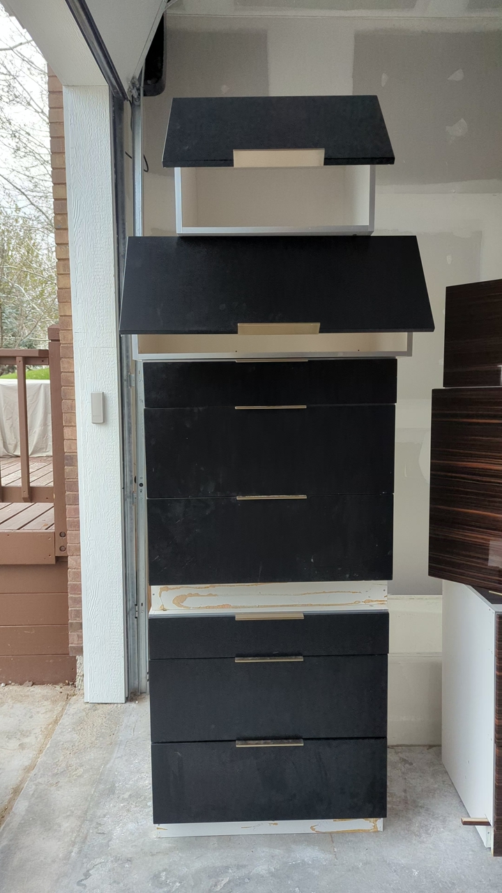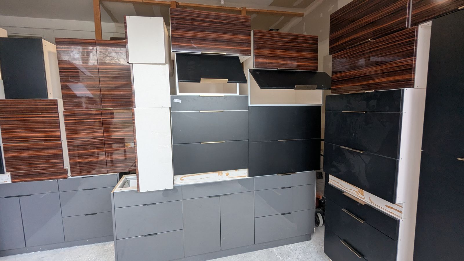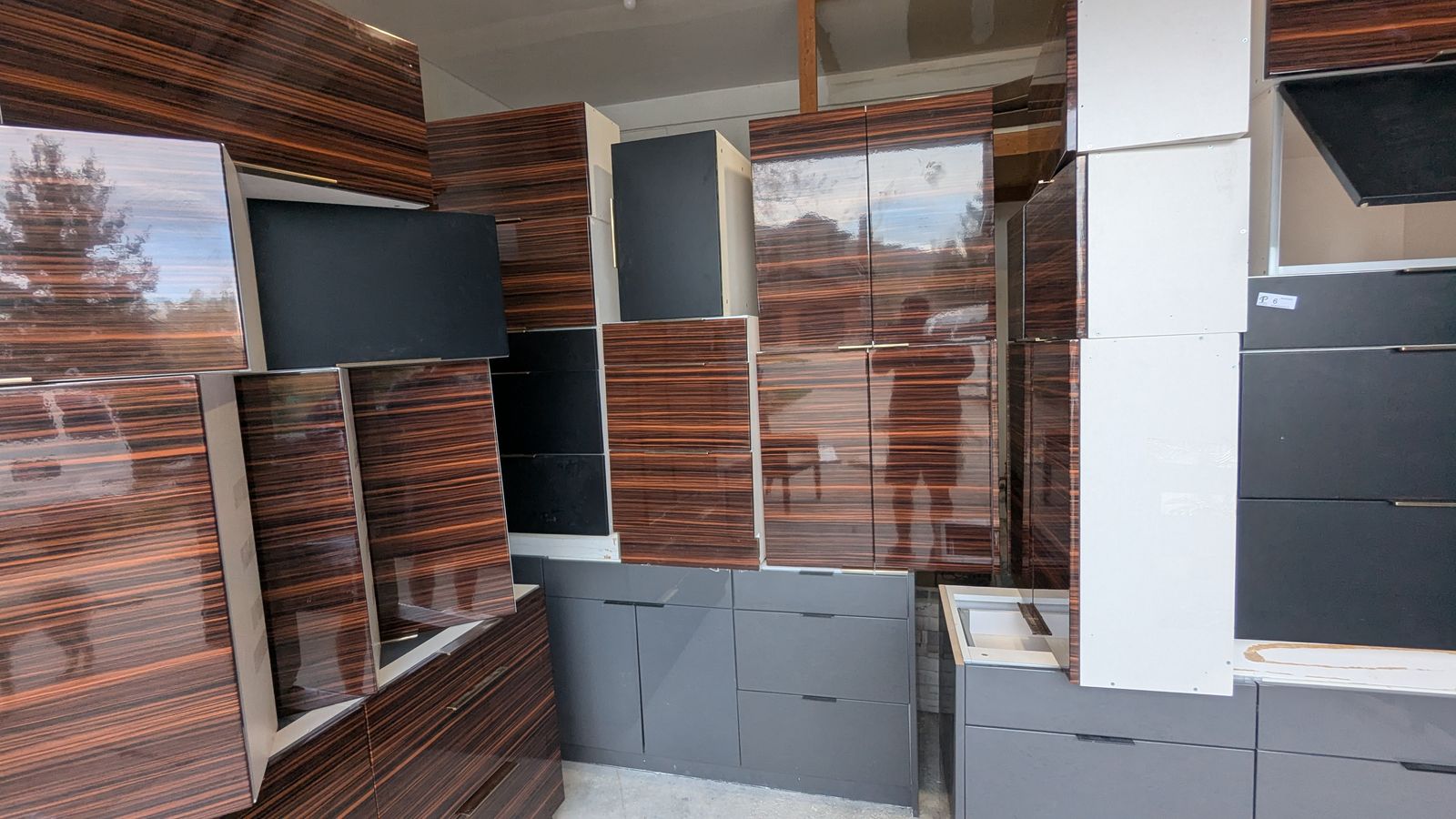 25 Upper/Wall Cabinets (various dimensions): Featuring a stunning mix of glossy horizontal woodgrain (looks like Macassar ebony) and matte black. Many feature premium lift-up door hinges.