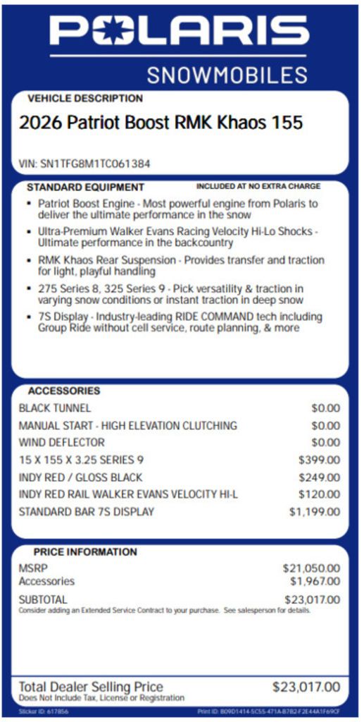 BLACK TUNNEL!MANUAL START - HIGH ELEVATION CLUTCHING!WIND DEFLECTOR!15 X 155 X 3.25 SERIES 9!INDY RED / GLOSS BLACK!INDY RED RAIL WALKER EVANS VELOCITY HI-L!STANDARD BAR 7S DISPLAY! New 2026 Polaris Patriot Boost RMK Khaos 155 Snowmobile For Sale In Salt Lake City, UT This New 2026 Polaris Patriot Boost RMK Khaos 155 Snowmobile is for sale at Karl Malone Powersports SLC conveniently located in Salt Lake City, Utah. Our knowledgeable team is eager to assist you, so don’t hesitate to contact us Snowmobile you're looking for don't hesitate to go back and revise your search. We're sure to have the perfect Snowmobile for you in our showroom in Utah. We invite you to visit us at Utah’s premier Polaris dealer for new and pre-owned Snowmobiles for sale. Let us help you find the ideal Snowmobile to take home today! Karl Malone Powersports SLC Address: 1379 W 3300 S, Salt Lake City, UT 84119 Phone: (801) 972-8725 2026 Polaris Patriot Boost RMK Khaos 155 BLACK TUNNEL! MANUAL START - HIGH ELEVATION CLUTCHING! WIND DEFLECTOR! 15 X 155 X 3.25 SERIES 9! INDY RED / GLOSS BLACK! INDY RED RAIL WALKER EVANS VELOCITY HI-L! STANDARD BAR 7S DISPLAY! The Ultimate in Dynamic and Agile All-Mountain Performance The RMK Khaos delivers transfer and traction for a wild and playful ride in the backcountry. RMK Khaos models are lighter than the competition for easier maneuverability and better flotation in deep snow conditions. Features may include: Quicker Response. Higher Track Speeds. QuickDrive is the lightest drive system in the industry and produces the lowest inertia for optimum response. Choose between the 325 Series 9 Track for instant traction and forward drive in deep snow or the 275 Series 8 track for versatility and traction in varying snow conditions. Float And Fly The RMK Khaos Rear Suspension features geometry that provides transfer and traction for light, playful handling, along with the best response and control in all riding zones. Available in 146, 155 and 165 lengths. Big Time Shocks for Big Time Terrain Ultra-premium Walker Evans Hi-Lo Shocks are the best of the best in extreme mountain conditions. They feature remote reservoirs for increased oil capacity to ensure all-day performance and durability, along with high and low-speed compression adjustment to dial in the ride.