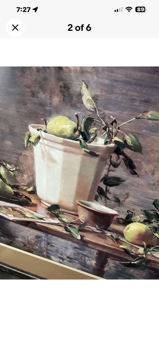 Pears & Tapestry. 30" by 22" unframed. 41" by 33" framed. Print or Litograph by Delbert Gish (Born 1936) is active/lives in Washington, Oklahoma. Delbert Gish is known for Still life, portrait, landscape paintings. The Frye Art Museum, Seattle, Washington commissioned a Gish portrait of Mrs. Greathouse, a former and major director of the museum, who is now near 100 years old. A major exhibition of 100 of his works was presented at the Frye Art Museum in 2004/2005