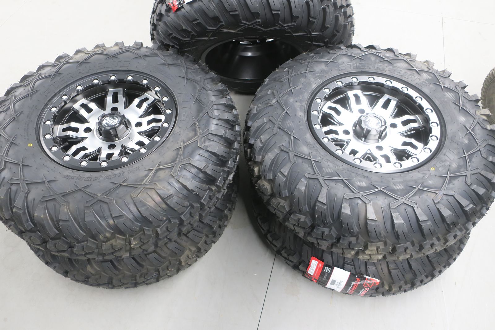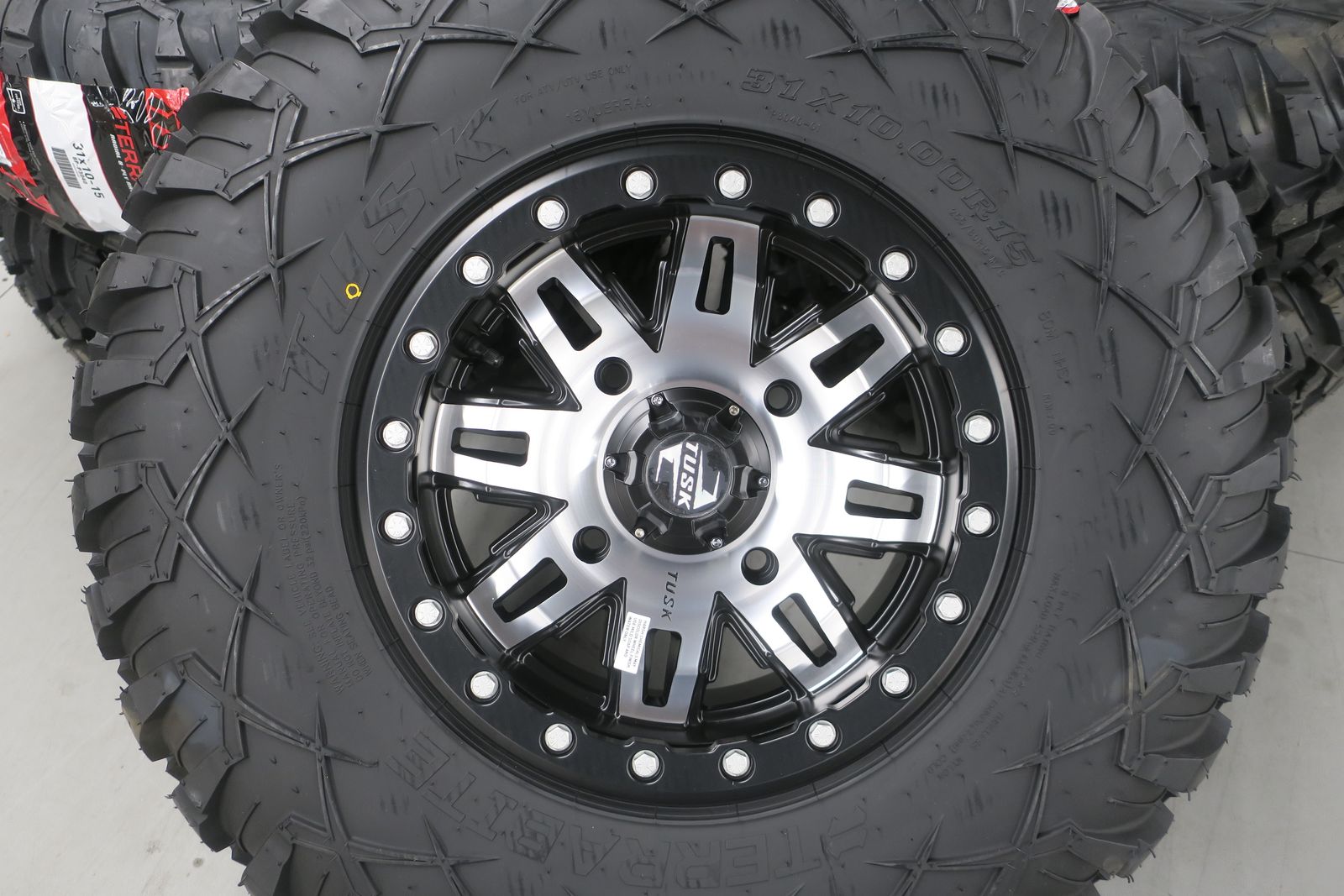 Tire and wheel package is brand new, these are for pick up only from our Payson UT showroom. Tax will be applied to the purchase price. Tusk Terrabite® Radial Tires 31x10-15 Medium/Hard Terrain on 4/156 Tusk Teton Beadlock Wheels 15x7 5.0 + 2.0 Machined/Black. These wheels do require the tapered lugnuts.