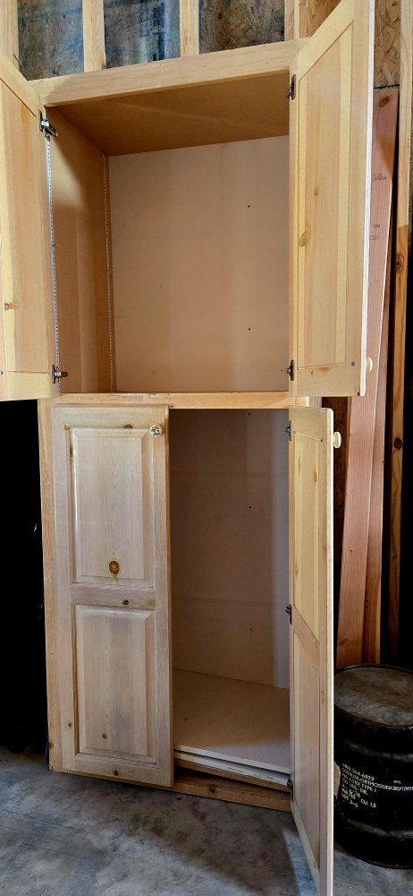 7 foot free standing solid pine cabinet. Has some melamine shelving.