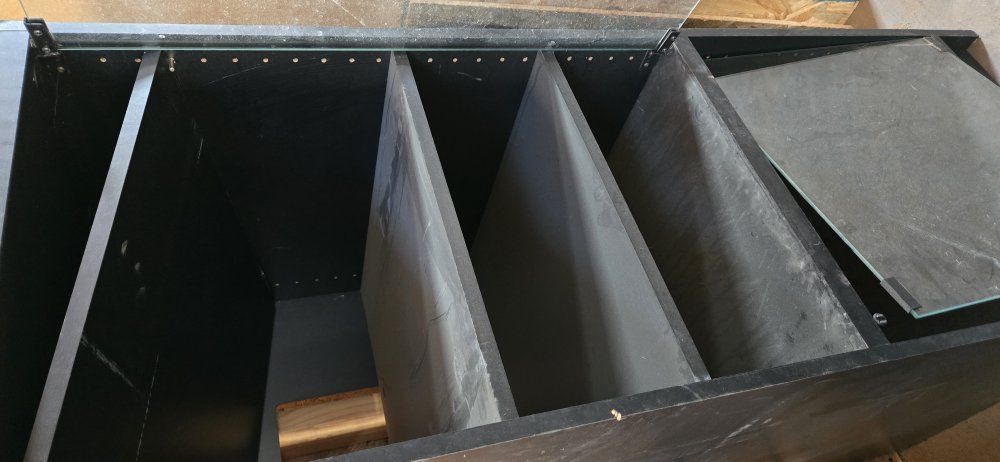 Black functional stereo cabinet. Glass doors, bottom one is bent.