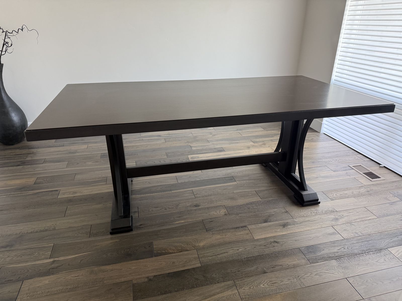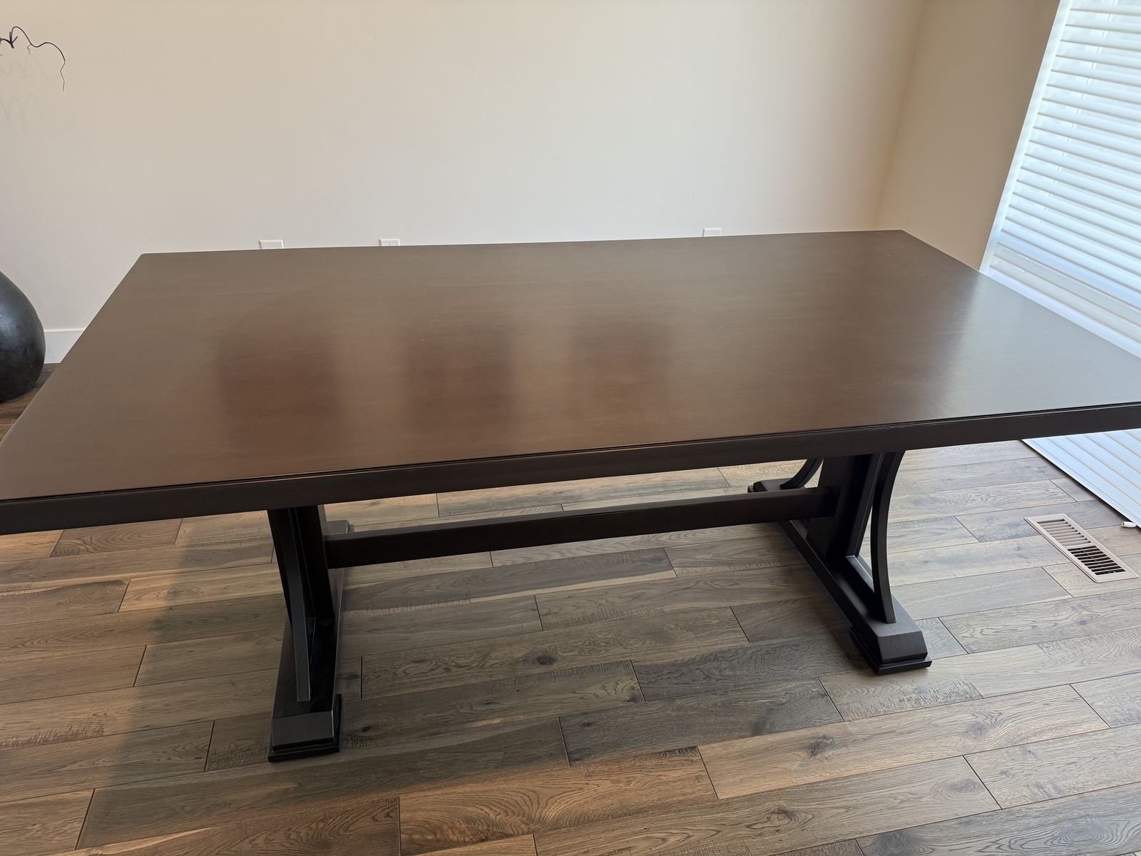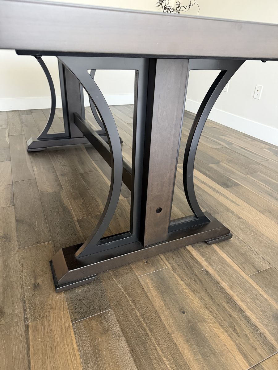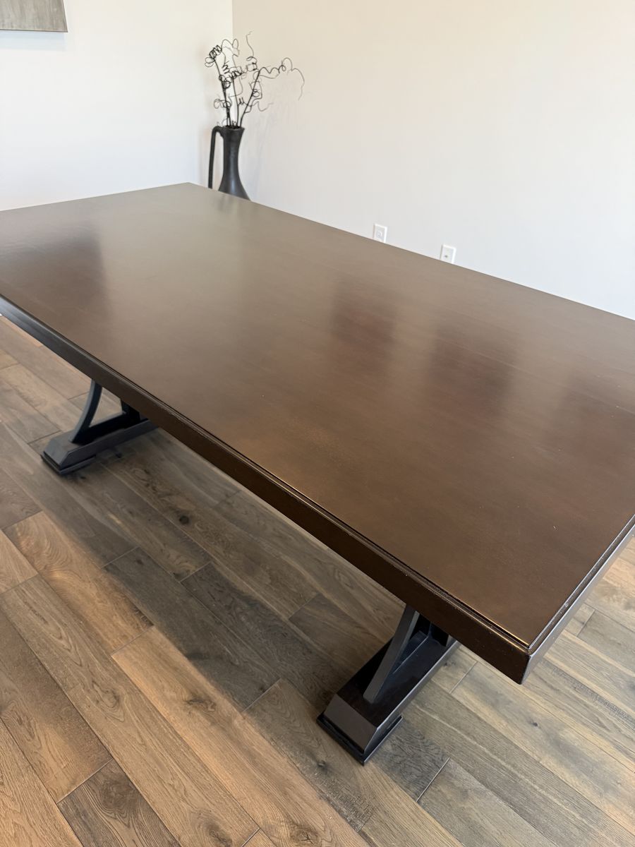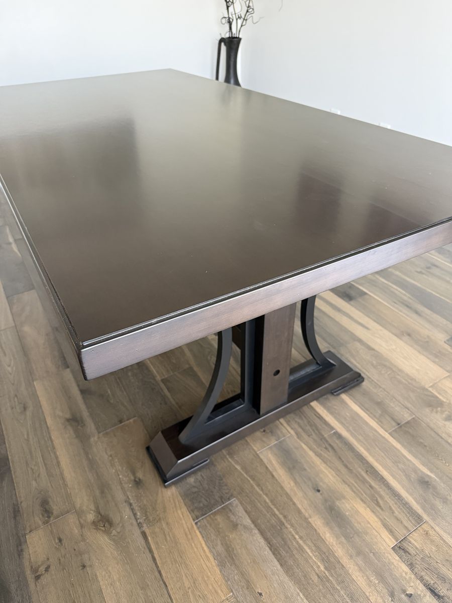 Beautiful modern dining table - barely used, sat at maybe three times. Very dark brown. Very heavy. Wood with veneer on top. 78”L x 40”W x 30”H