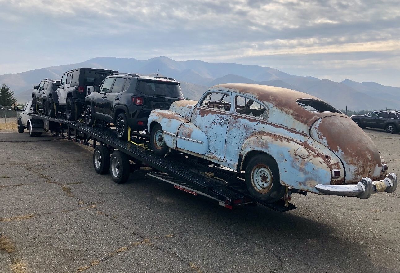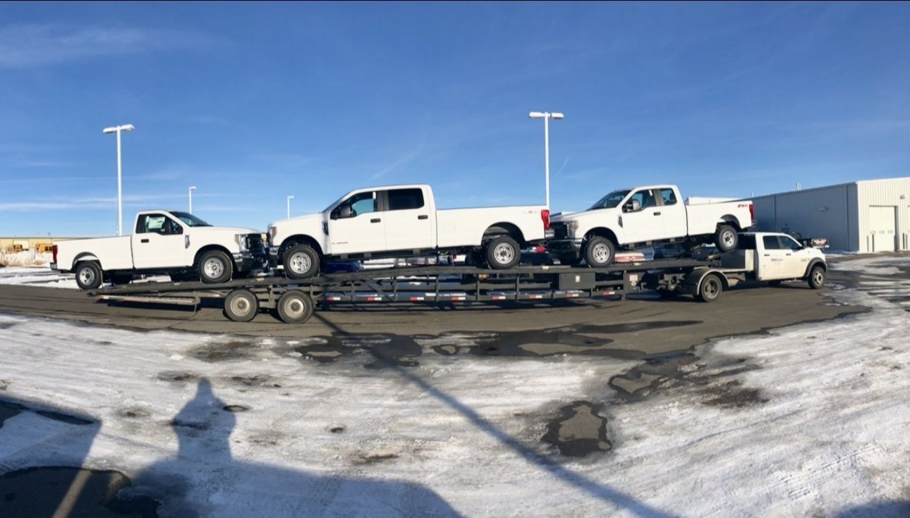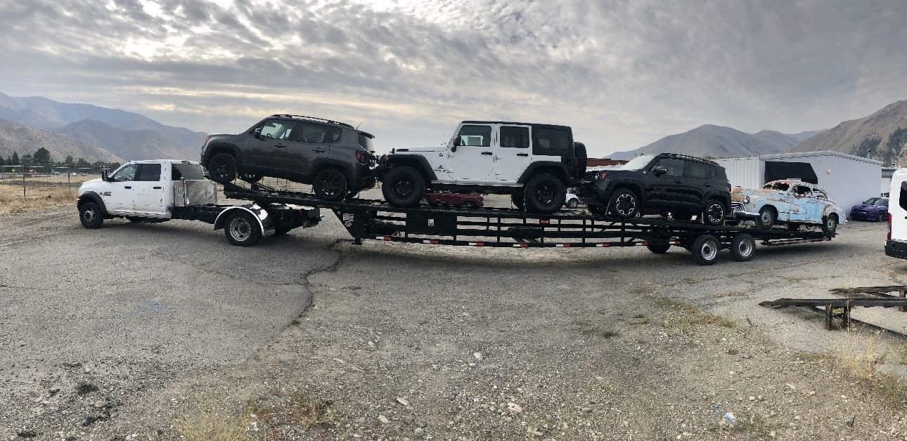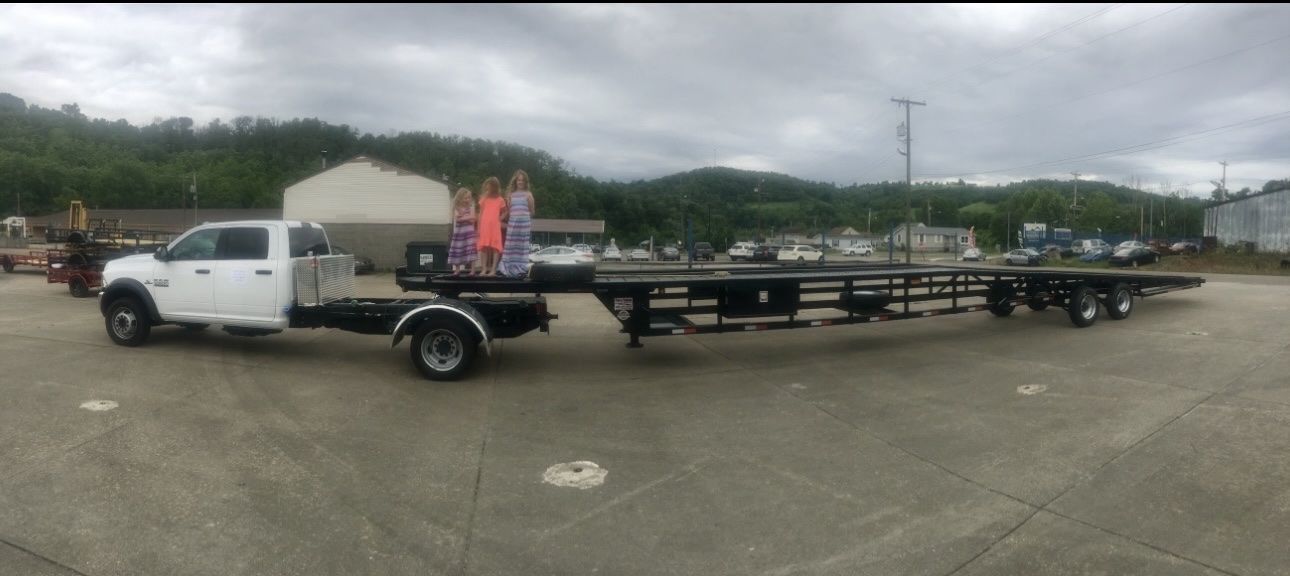 Venmo2018 Take 3 Lo Pro 53’ w/extentions front and rear(2 ft), 8.5ft wide, two 10K super single axles, kingpin hitch, four toolboxes, electric over hydraulic brakes, 7 pin plug, two new spare tires on rims, over the wheel straps and ratchets included. Electric over hydraulic brakes. Dry weight is 6000lbs. 3-4 car capacity. Conveniently lower to the ground for loading and strapping compared to wedge style gooseneck options. Can be hauled with medium duty chassis cab power units beginning with 3500/350 and on up.